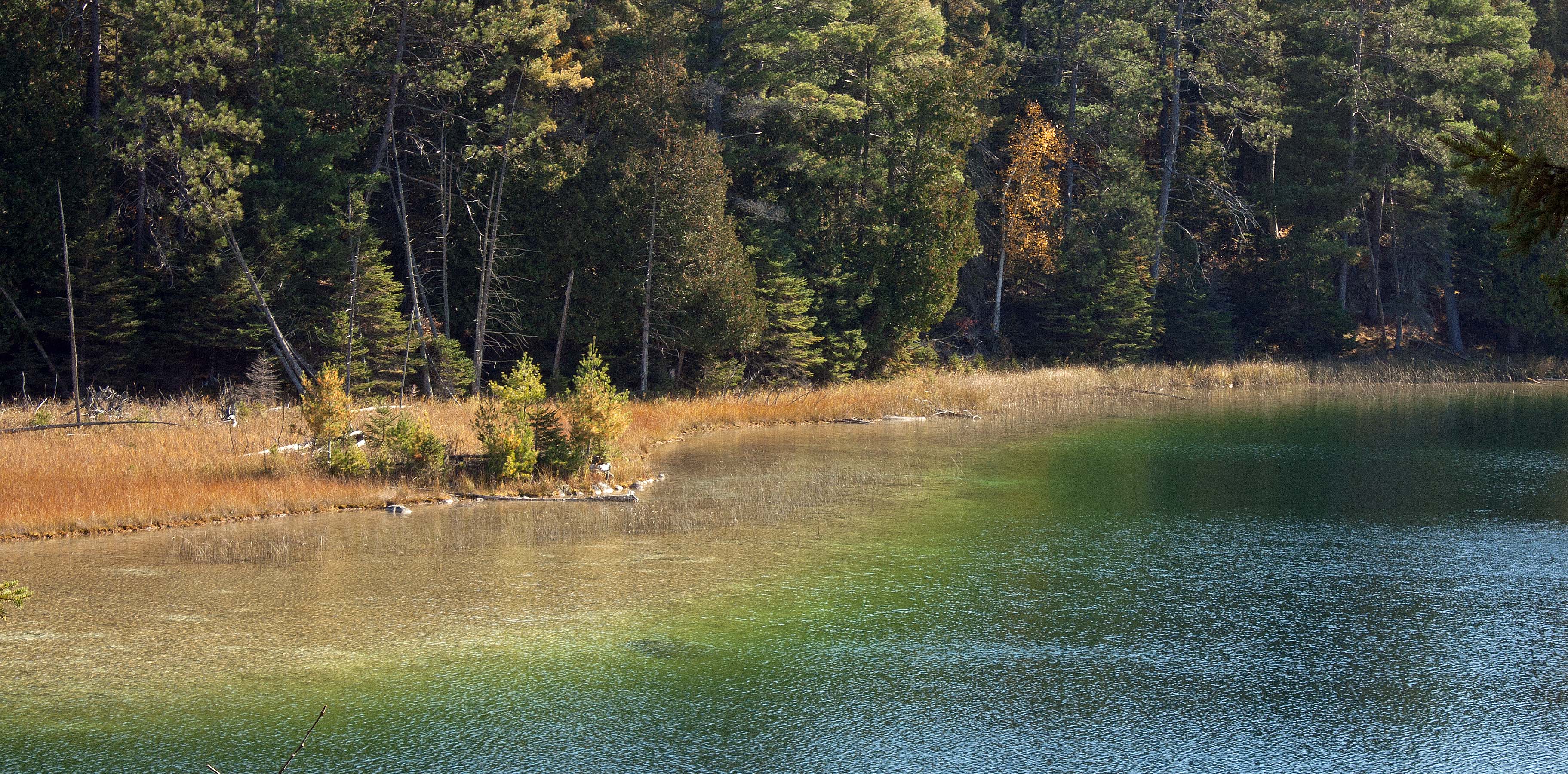 Lake McGinnis shoreline f18 Oct PPP ← Previous Eastern shore of McGinnis Lake in early fall, showing marl-covered shallows and deep jade waters