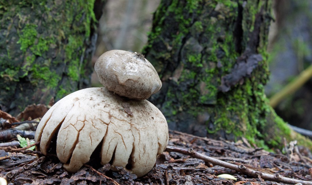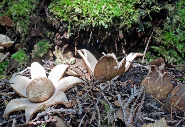 I saw every stage of Earthstar over the course of my visits: the early stage looks like a tear-drop shaped cocoa-dusted truffle, pushing itself out of the duff. The outer layer (exoperidium) cracks open and splits into several arms that spread out and down, lifting the spherical spore sac. The outer layer further splits around the perimeter of the spore sac to form a ‘collar’ around the base of the spore sac. These outer layers will later dry up into ochre-coloured patterned “rays” around the paper-like smooth spore sac (peridinium). The open pore (peristome) at the top of the peridinium is a small pointed beak that resembles a blue-grey fuzzy puckering mouth. When I poked one mature spore sac with an open pore, the ‘mouth’ released a blue-brown cloud of spores. Earthstars are used medicinally by indigenous peoples. The Blackfoot call them ka-ka-toos, meaning “fallen stars,” which—according to legend—are an indication of supernatural events.