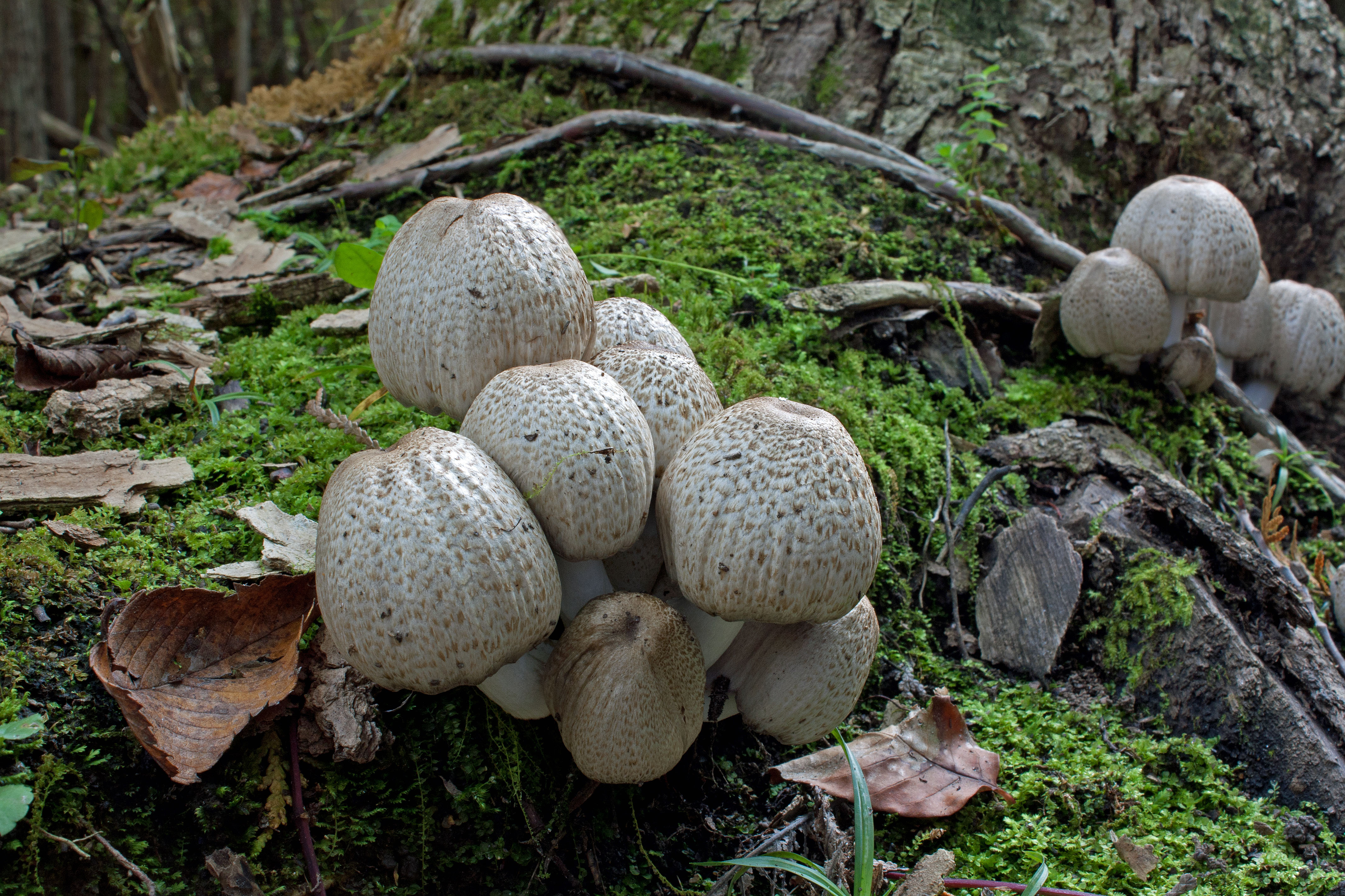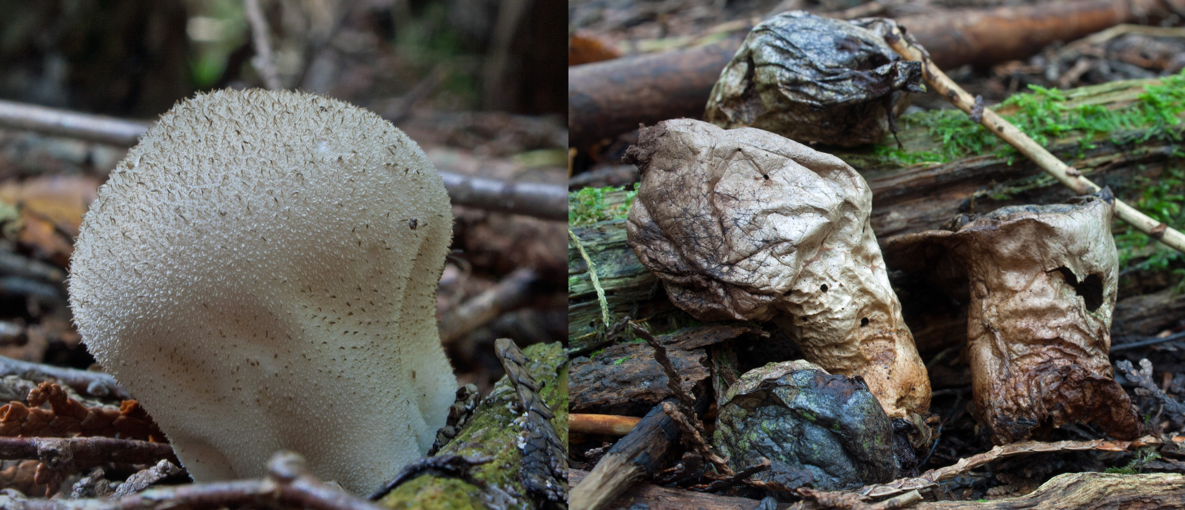 In a yellow-birch / cedar forest by the water, I found dense colonies of small white to tan-coloured puffballs bearing tiny spines. Most occupied the rotting birch logs. These pear-shaped puffballs are called Lycoperdon pyriforme.