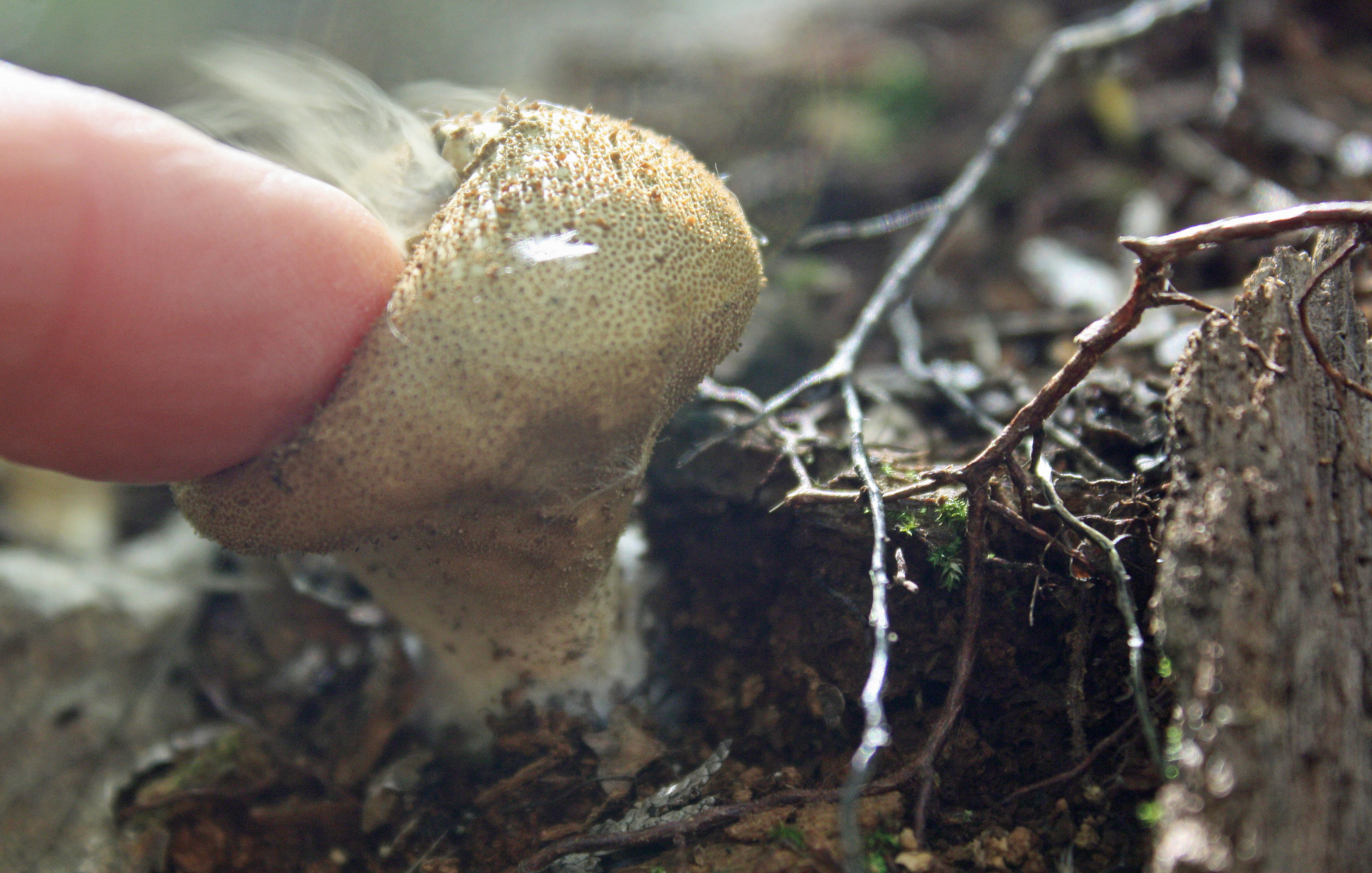 Driven by an urchin child’s memory, I found a mature puffball (one with an open pore at the top) and poked it with my finger, releasing to my glee a yellow cloud of spores. Early taxonomists obviously associated the clouds with flatulence, because the genus Lycoperdon means “wolf fart.” Most puffballs are mycorrhizal and manufacture their spores inside, rather than on the outside on gills or tube structures. Their outer cover is called a peridinium and when a rain drop punctures it–or a probing finger–a tiny pore opens and releases a cloud of spores.