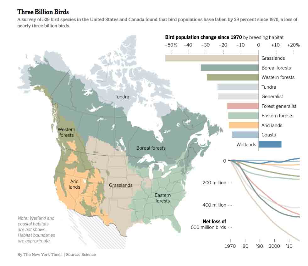 “The skies are emptying out,” wrote Carl Zimmer in a 2019 issue of The New York Times. Zimmer reported that the number of birds in North America has declined by three billion, some 30 percent, over the last half-century. The October 2019 issue of Science magazine reported a staggering decline in North American birds. Kenneth V. Rosenberg and his team of researchers estimated that three billion birds of various species have disappeared in Canada and the US since 1970.