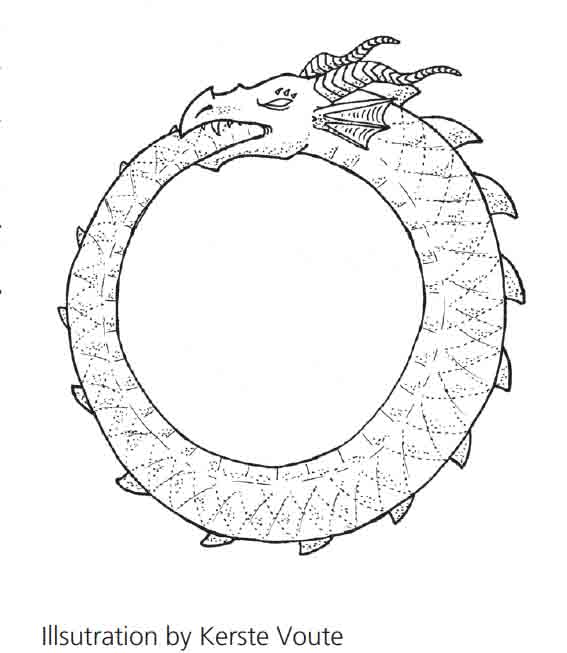 Destruction in creation and creation in destruction lies ingrained in the life-cycles of everything on this planet. A forest fire can destroy life but in so doing creates a more vibrant, healthier forest. This brings to mind the Ouroboros, the mythical snake that swallows its own tail to sustain itself in the Greek prophecy of the Suntelia Aion, the calamitous “End of an Age”.
