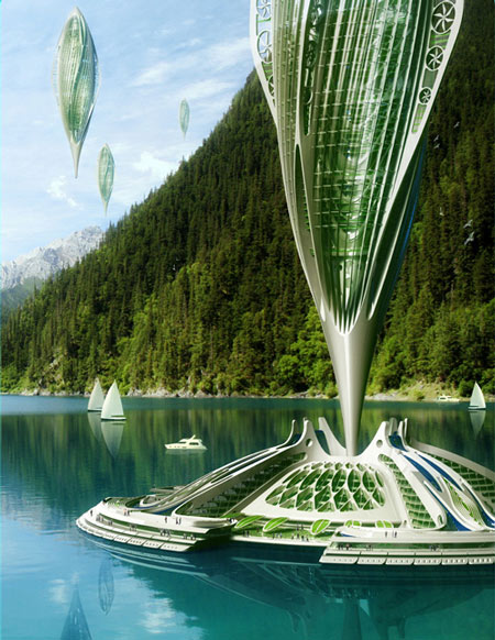 You swipe your PAL over the ticket booth sensor and the optional ticket-brochure pops out. You take it and read the specs between glances at the tall vessel loading in the dock of the hub. It’s really like a vertical dirigible, you think, studying the seed-shaped airship with self-cleaning “intelligent” nanostructured glass—inspired by the lotus leaf that doesn’t get wet. The semi-rigid unpressurised airship stretches vertically around an arborescent spine that twists like chloroplast ribbons 400 meters high and 180 meters in diameter.