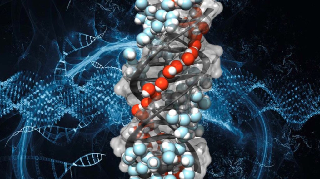 “Researchers at the University of Notre Dame have observed for the first time a chiral water superstructure templated around a biomolecule. Although many studies have demonstrated the direct interaction of water with highly important macromolecules like DNA, the latest study is a final confirmation that water forms a unique and enduring super-structure around the DNA double helix — stabilizing the molecular conformation, mediating its functionality and interaction with important information intermediaries like RNA polymerase.”