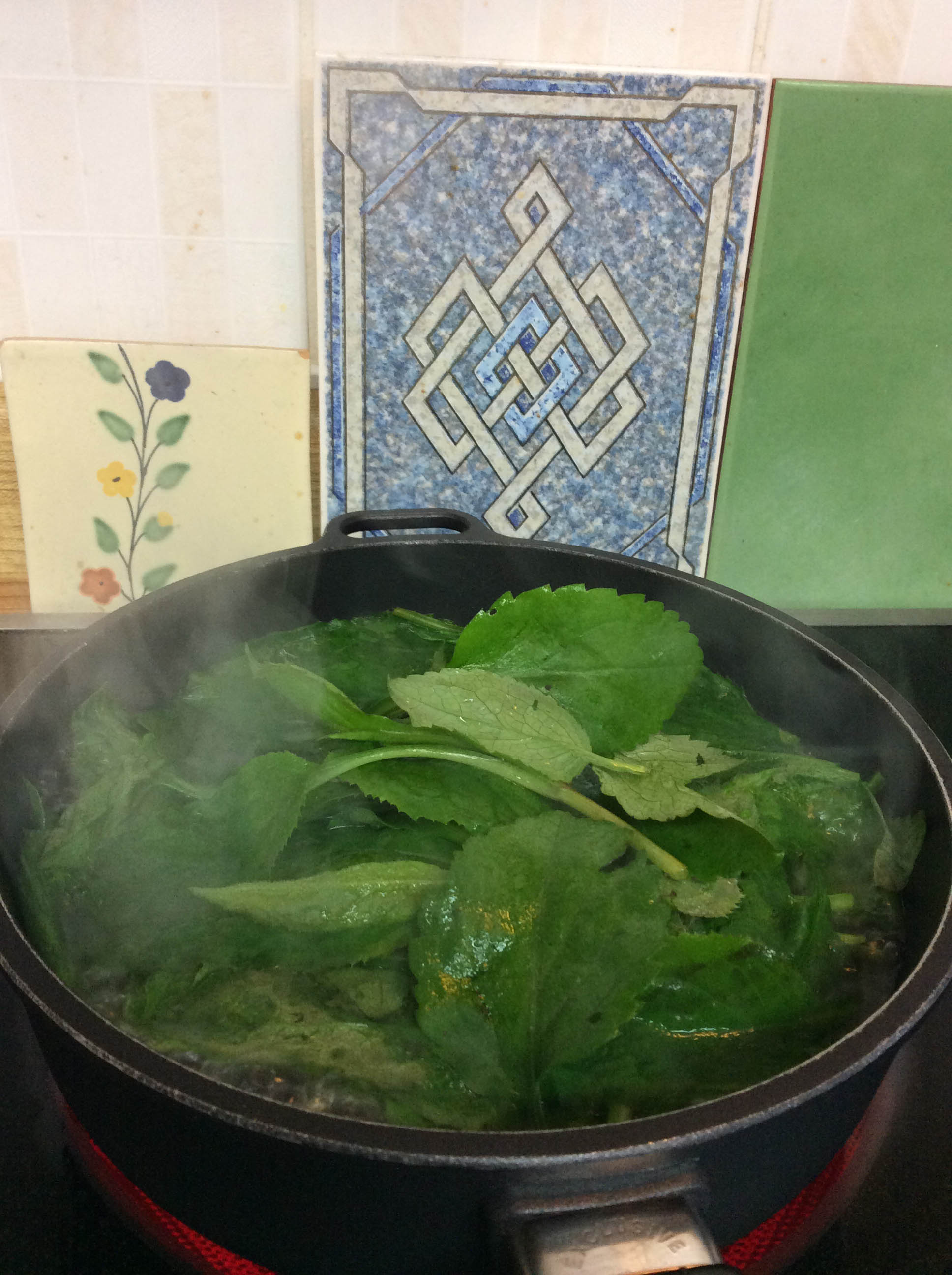 I started by boiling the nettle leaves and stems for a few minutes then transferring the nettle—with sting denatured—to a bowl. I kept the boiled liquid for later use (in the creamed sauce and for tea later).