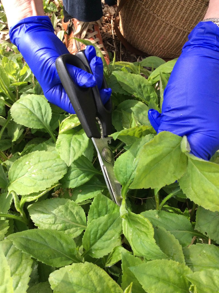 Merridy and I went picking that day. We noted that the area where we picked was clean and free of chemical sprays. Using scissors, Merridy carefully snipped the top leaves at an angle and placed them in her basket. We picked a basketful then rinsed the nettle in a colander in preparation for cooking later that day for supper.
