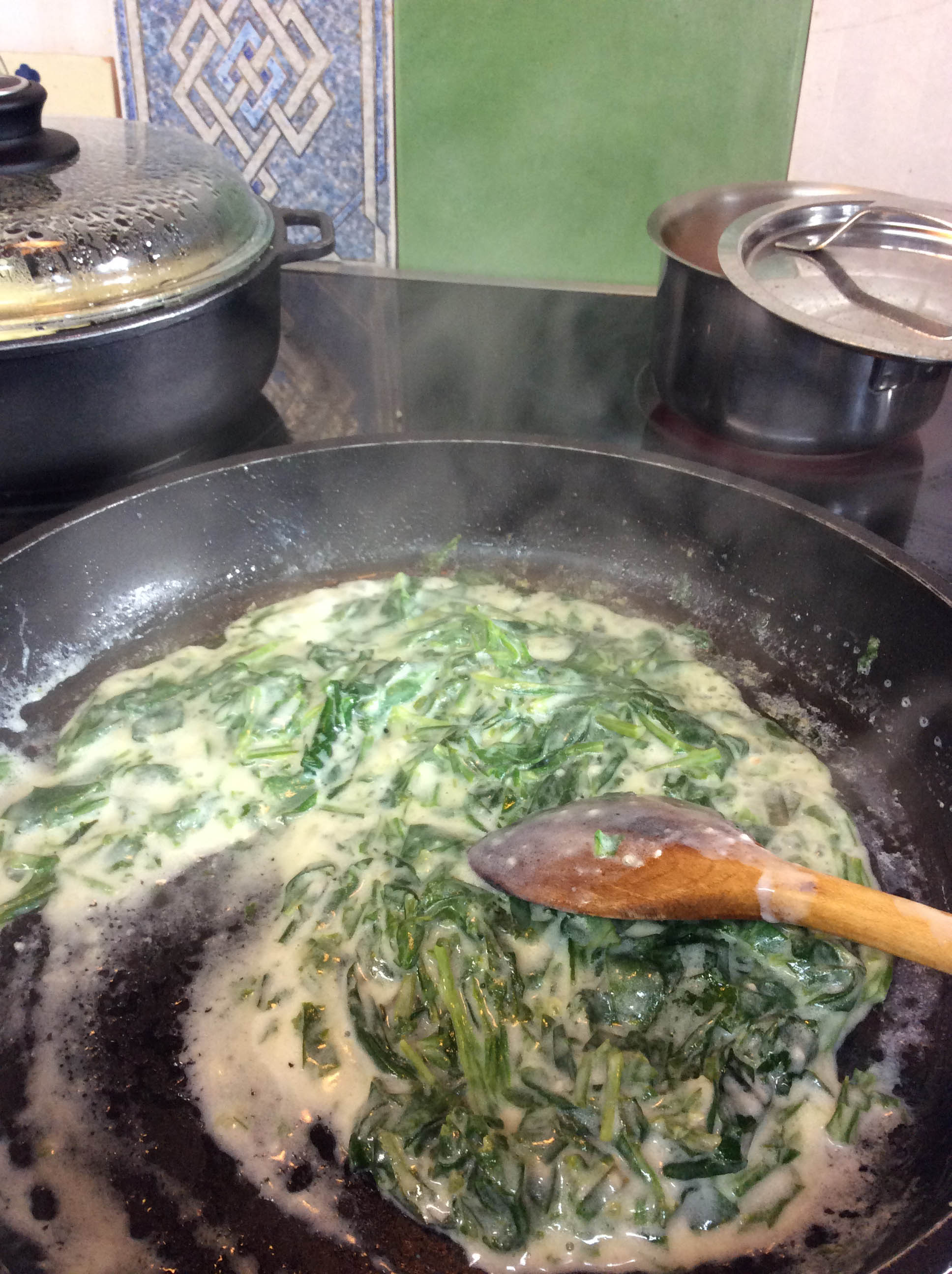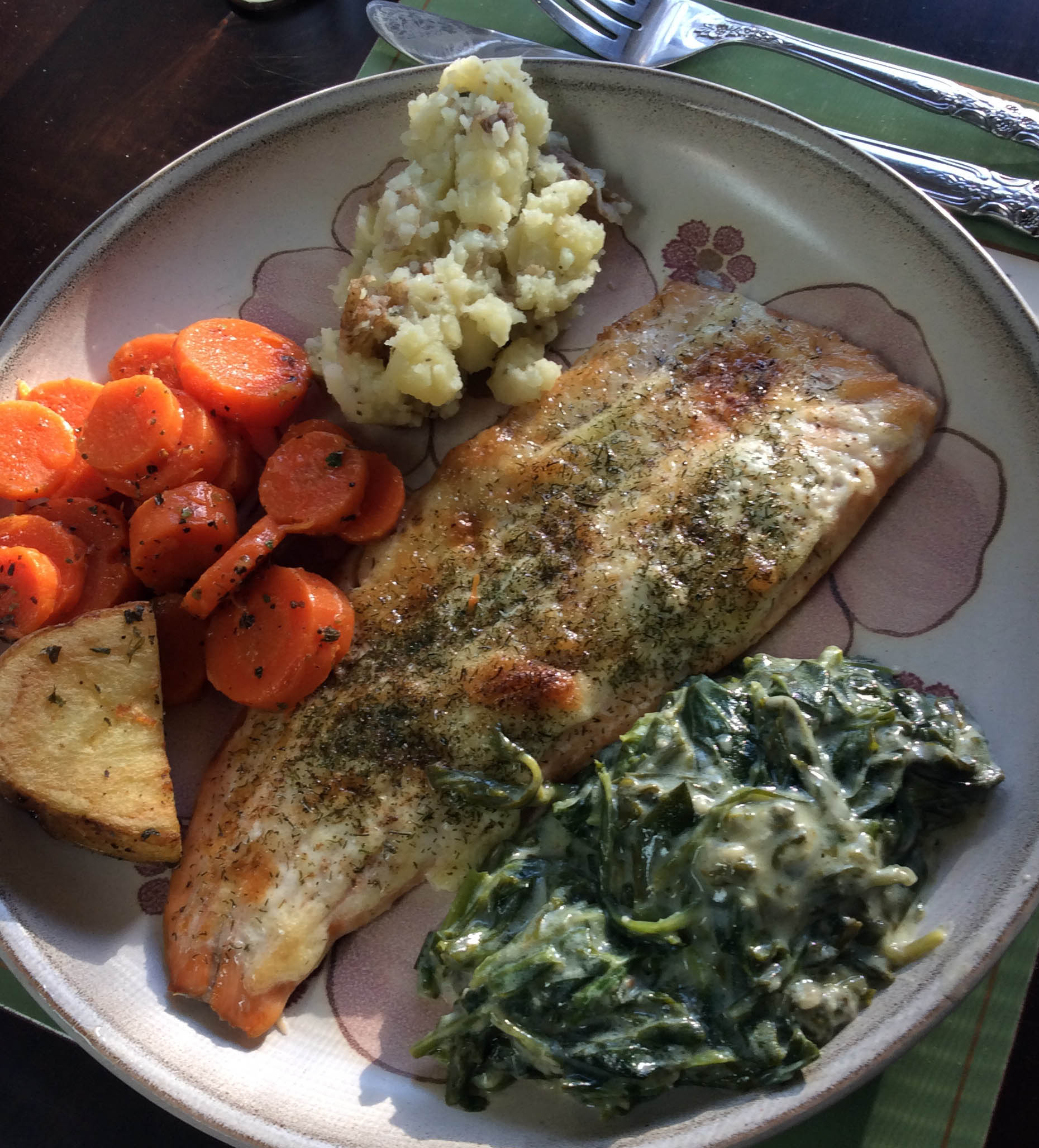 Once the nettle leaves had cooled sufficiently, I chopped them up a bit then sautéed them in butter and garlic and flour. I added some of the nettle boil water and stirred then added milk, sour cream, and a pinch of nutmeg and—voila—I had a wonderful creamed nettle side vegetable to complement the baked trout, carrots and roasted potatoes I’d made for supper.