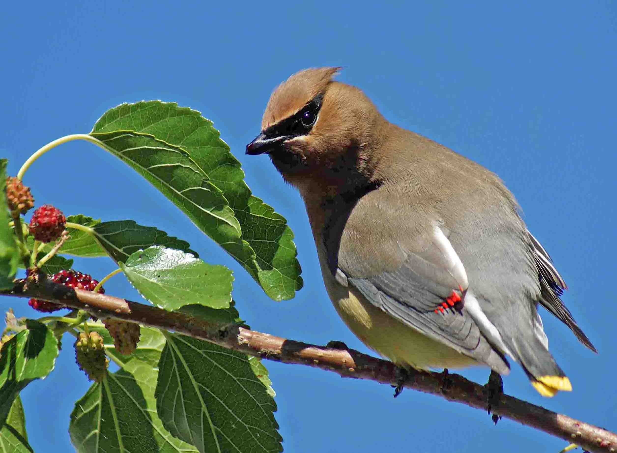 Cedar Waxwing perches on a mulberry tree, ON (photo by Merridy Cox)