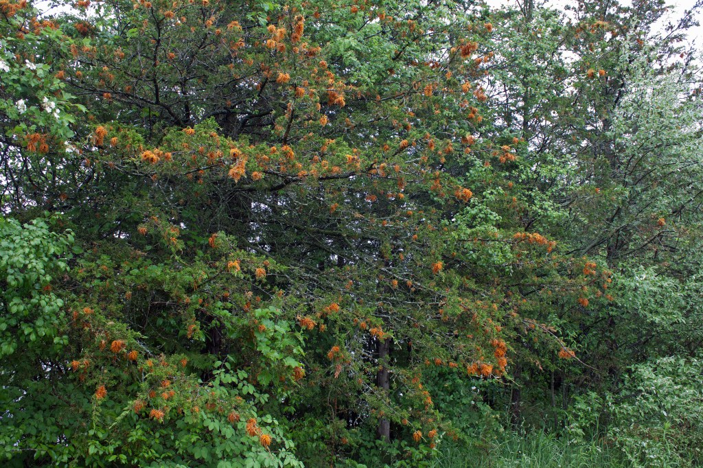 Juniper by the river hosts cedar-apple rust with profuse jelly-like telia horns that carry fungal spores, ON (photo by Nina Munteanu)