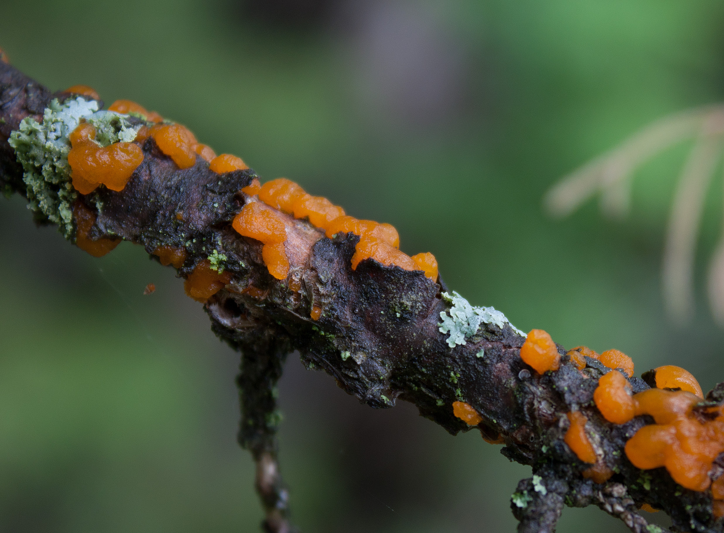 Squeezing the jelly-like fungal tendrils, leaving orange residue on finger (photo by Nina Munteanu)