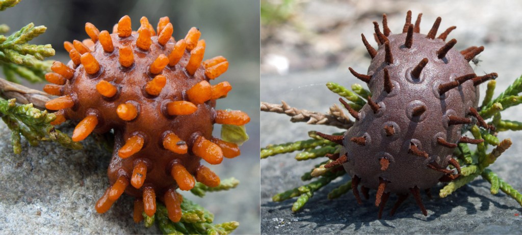 The cedar-apple rust starts out as a brown-greenish gall on the juniper in spring (after overwintering). The galls develop indentations that turn into ‘pimples’ with ‘pores’ from which exude orange jelly protuberances. The jelly ‘flowers’—called telia horns—exude from the galls in a burst of show in early June or late May (after a warm rain), and quickly dry up within days, waiting for the next wetting period.