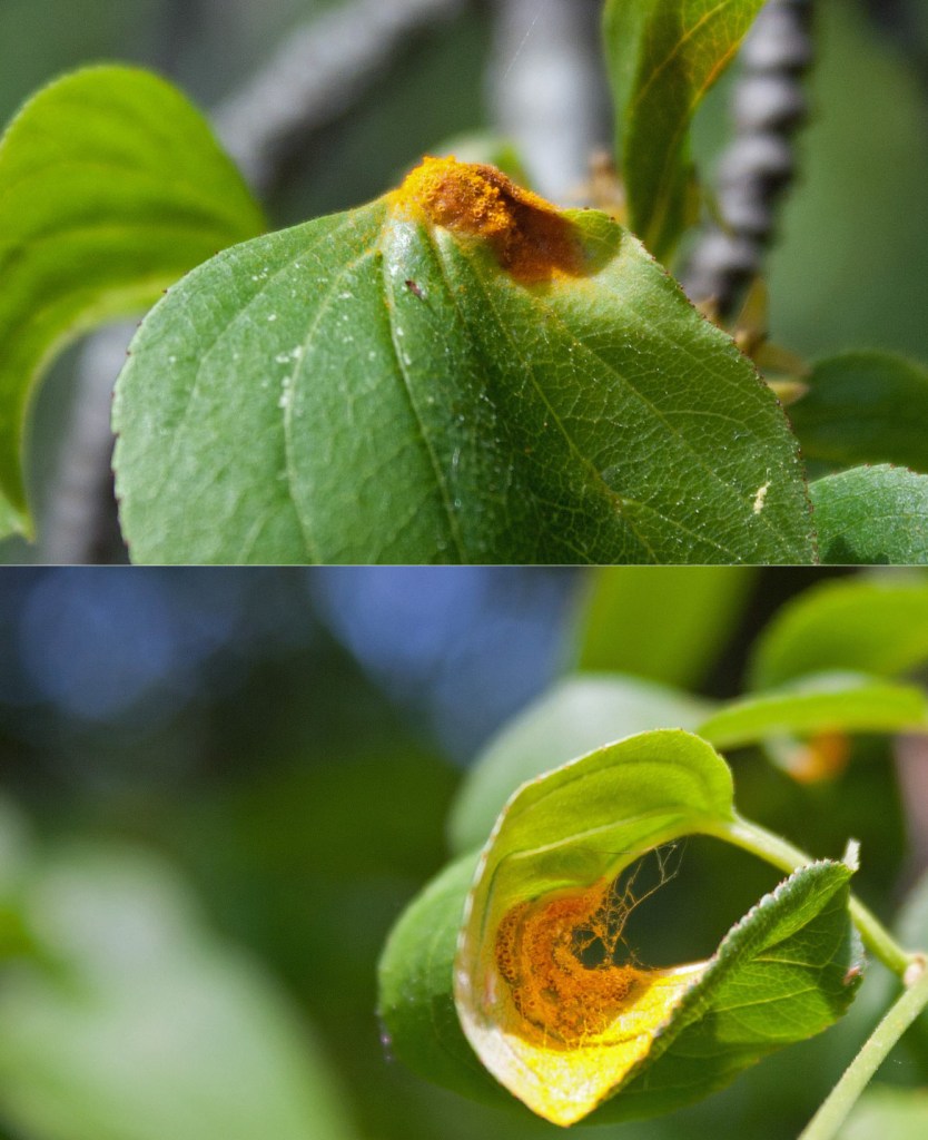 Cedar-apple rust on the underside of buckthorn leaf. Upper: showing both sides of the leaf and flowers; Lower: close up of rust growth showing cup-shaped apparatus (photos by Nina Munteanu)