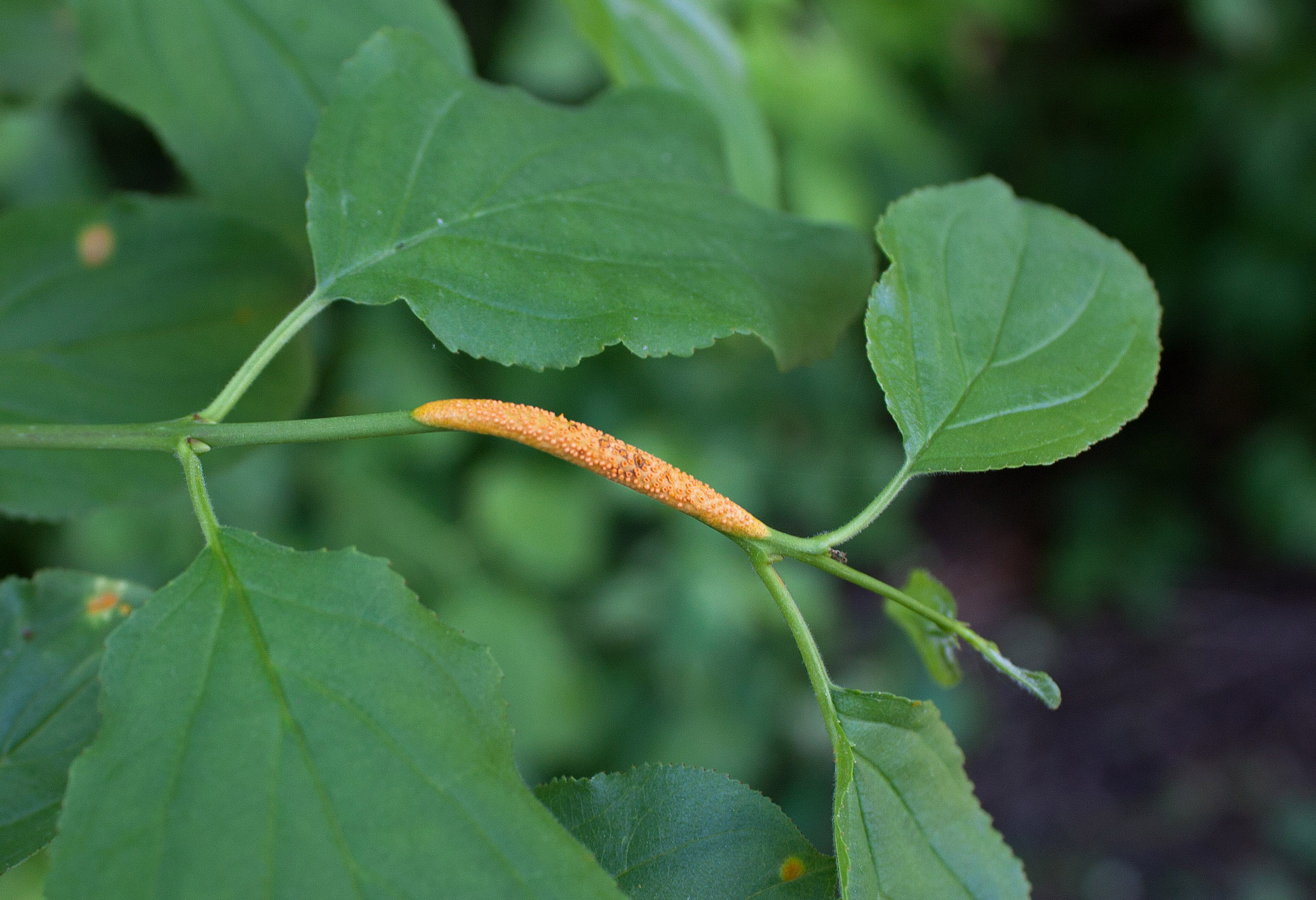 Cedar-apple rust on stem of buckthorn showing cup-like growths (photo by Nina Munteanu)