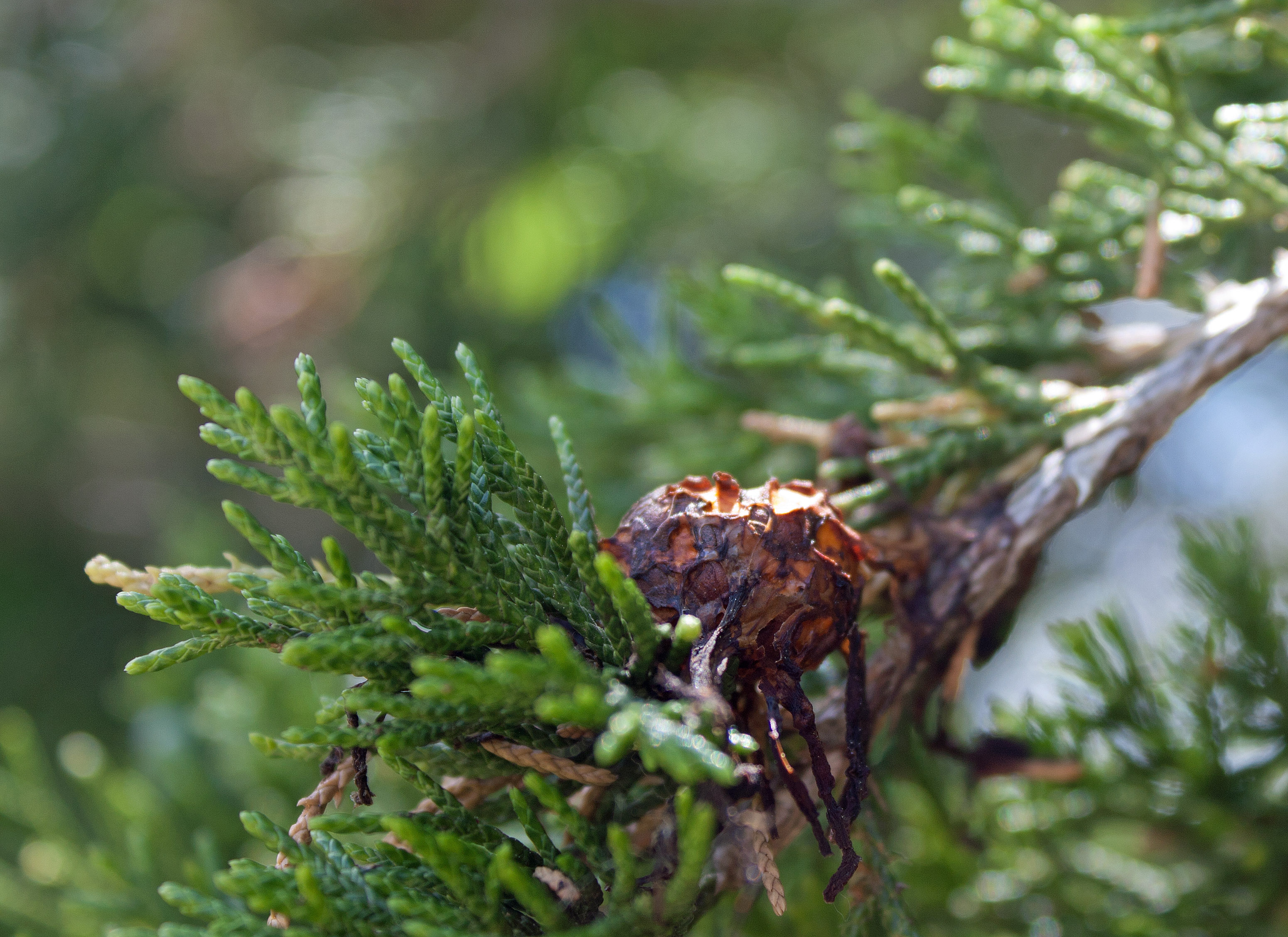 Every story has a conclusion, and that is true for this strange interactive fungal-plant association. For several weeks I observed the orange goo ‘flowers’ on the juniper ‘bloom’ after a warm rain then shrink back to the original gal with shrivelled ‘fingers’ ready to develop into jelly telia horns in the next rain. Then, after several weeks of this shrinking and extending, I noticed that even during a great rain, the telia horns no longer extended; on some gals, orange wet ‘pimples’ remained, like weeping sores. This stage of the rust had done its job of dispersing basidiospores. Now, with the dry weather, the outer part of the gall, no longer producing spores, turned brittle and friable. I noticed dried up blackened telia horns on several. Up to then, the juniper had looked slightly beleaguered by the extensive fungal infestation; some of its leaves seemed to be choking beneath the strangling galls. But, like shedding a disease that had run its course, the juniper was discarding the galls. They fell off easily in my hands. At the slightest nudge, the gall dislodged, as if just hanging on by a thread. The juniper was left totally unscathed underneath; it had lost a few of its leaves, but otherwise looked as green and healthy as ever. It was remarkable.