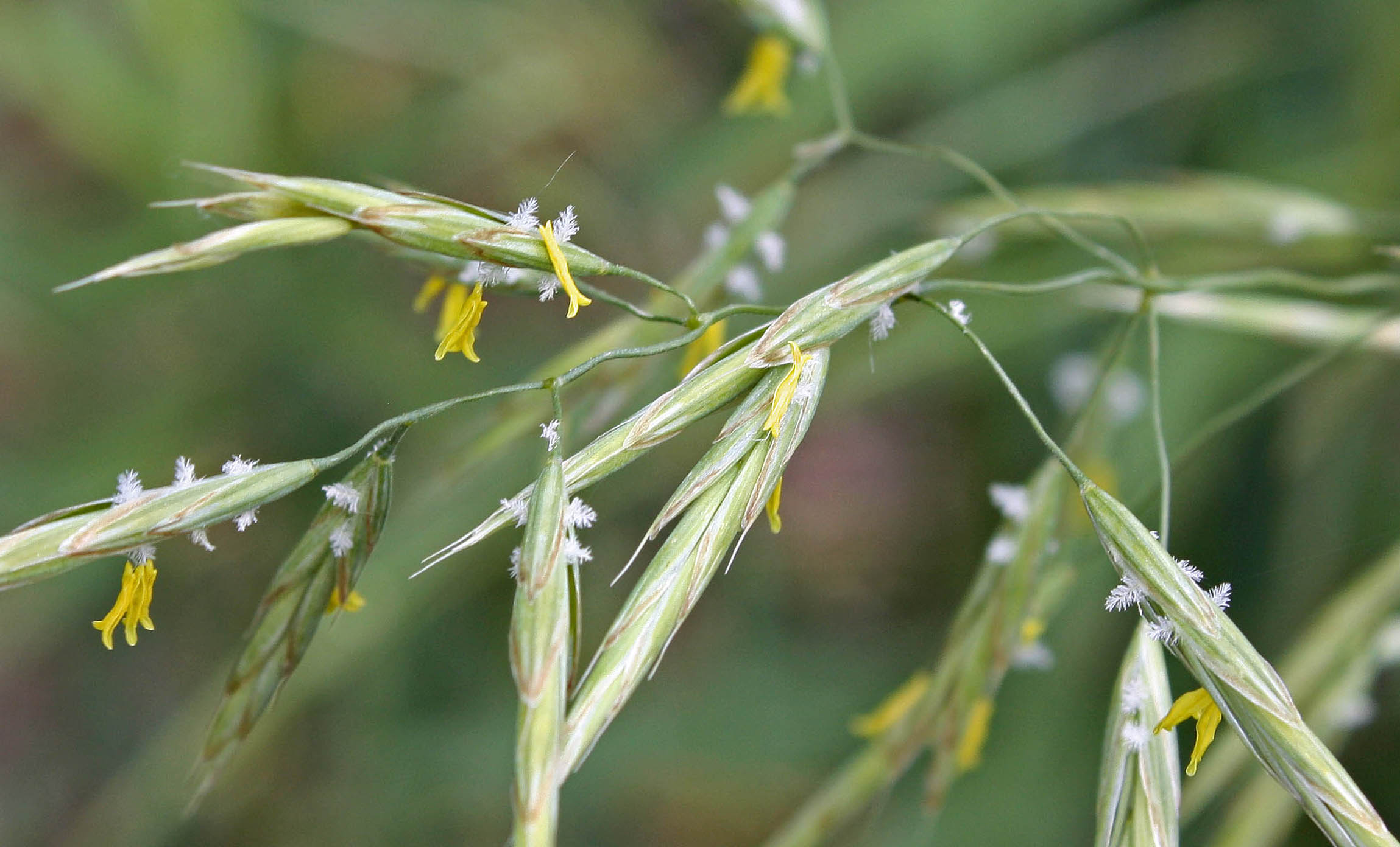 It was early June and I was walking the trail through the local thicket by the river, when I first noticed them: tiny yellow rods dangling off the brome grass spikes. Already handsome in their general stature—an erect panicle of spikelets that spread out like a Christmas tree—the grass spikes were now covered in bright yellow ‘Christmas lights’. On close inspection, the rods looked like two slim ladyfingers stuck together and dangled off a thin filament out of the grass floret: these were anthers carrying pollen! Once I noticed the anthers, I saw among them white feathery plumes poking out of the two separated sheaths or bracts (the palea and lemma)—the female stigmas! I was now fully engaged. Ignoring my possible allergies, I gathered a few spikelets and returned home to investigate more closely with my hand lens and to document with the close-up lens of my camera. I also did some research on this common but intriguing grass.