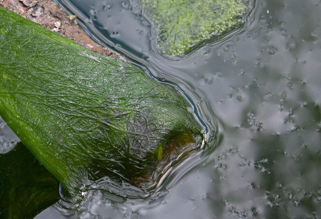 Given that the Otonabee River is regulated by several hydro-generating dams and locks to control its flow and provide electricity, it’s not surprising that many of the diatoms in the foam are periphyton (attached algae) that have sloughed off a submerged surface in the sudden turbulence caused by the dam release. You’ve seen periphyton; they are the slippery brownish, oily-looking felt mats that cover the cobbles and rocks of streams and rivers. Sometimes, they grow bright greenish ‘hair’, most likely one of the three most common filamentous green algae (Spirogyra, Zygnema, and Mougeotia), all of which I’d already observed growing on the river banks in the spring.