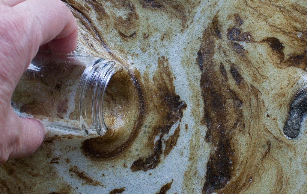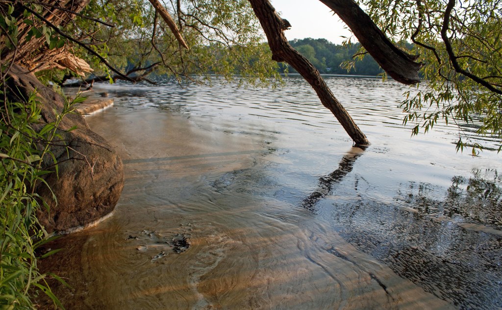 On a late July morning, I was on my daily walk along the Otonabee River in the Kawarthas when I noticed a yellow-brown creamy film on the water lapping onshore. In some places it looked like left-over dishwater; in other places where it had a better chance to collect, it resembled cream. The multi-hued film swirled like flowing paint in an Emma Lindstrom artwork. It was the “eddy shedding” patterns of Saturn’s north polar atmosphere or Jupiter’s Great Red Spot.