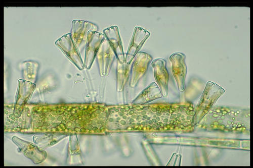 Just like trees, the canopy-forming long-stalked diatoms effectively compete for available light and nutrients in the water with their vertical reach. They provide the ‘overstory’ of the diatom forest’s vertical stratification. These tree-like diatoms also provide an additional surface for other diatoms to colonize (e.g. tiny Achnanthes settle on the long stalks of Cymbella, just as lichen does on a tree trunk).