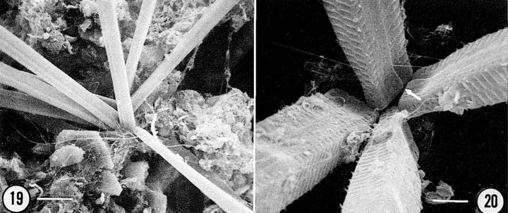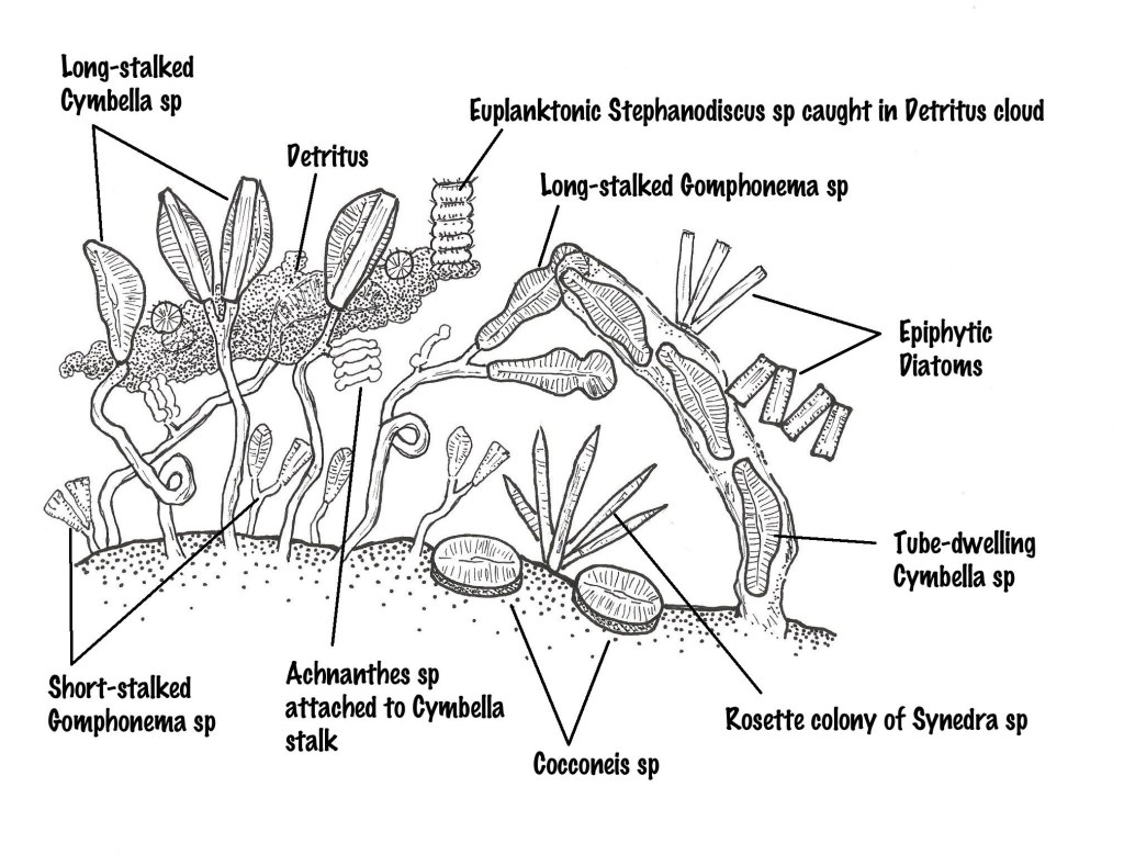 The stalked diatom forest acts like a net, trapping drifted-in euplankton, such as Pediastrum sp. and Fragilaria spp., which then decide to stay and settle in with the periphyton community. The mucilage captures and binds detrital particles in both lower and upper stories of the diatom forest. These, in turn, provide nutrients for the diatom forest and additional surfaces for colonization. In their work with periphyton communities, Roemer et al. (1984) found several diatoms (e.g. Diatoma vulgare, Fragilaria spp. Stephanodiscus minutula) entangled in the complex network of cells, stalks, and detritus of the diatom forest’s upper story. They also found rosettes of Synedra radians—like jungle orchids—attached to large clumps of sediment caught by the net of mucilage.