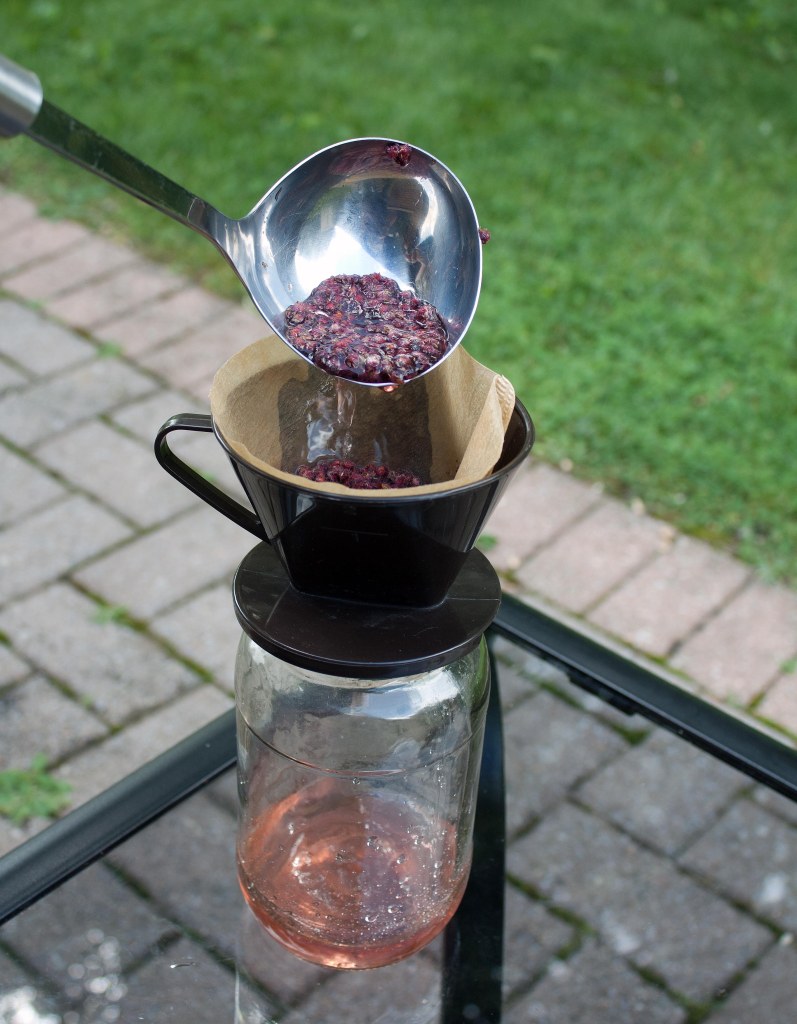 One morning in mid-August Merridy and I collected six sumac bobs to process. Some were a dark red wine colour but still looked fresh. Others were a lighter colour. We used the red wine coloured bobs and Ashley’s steps to prepare the fuzzy drupes for sumac lemonade. We started by separating out worm-infested parts (usually on the inside of the panicle) by pulling apart the small branches of the panicle. Separating the fresh drupes from the detritus on each panicle branch was a sticky process and gave me the excuse to lick my fingers. The burst of ‘citrus zest’ surprised me. We then immersed the fresh drupes in cooled boiled water. Almost immediately upon immersing the fuzzy seeds, the water took on a pink tinge. We waited about four hours until tea time to sieve our infusion through a coffee filter.