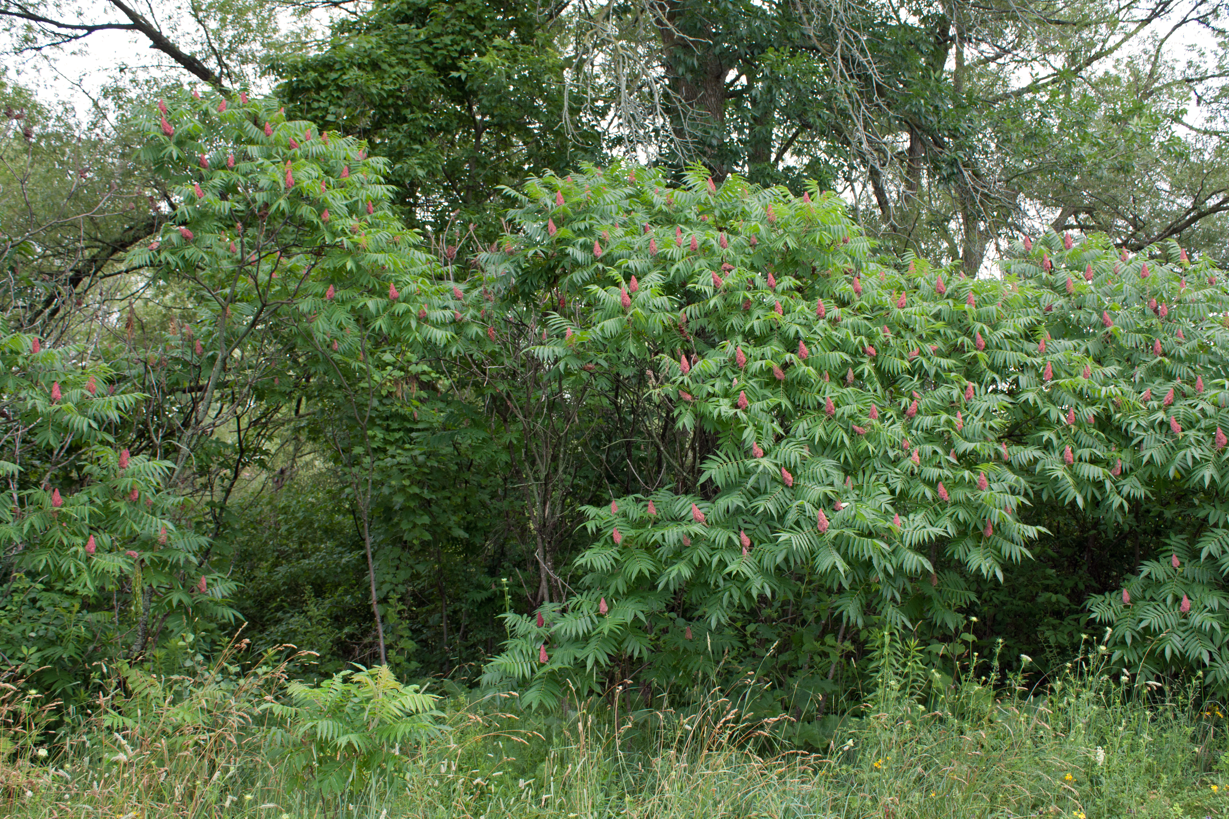 I first noticed sumac on that trail in the hydro corridor near my house. It spread down each side of the path, arcing over the top in a canopy that reminded me of pathways from picture books or from the movies, where only dappled sunlight pierces the dense, umbrella-like foliage. With its long, glossy day leaves and bright clusters of scarlet drupes, paired with the abiding humidity of Toronto’s summers, when you were walking the path you could almost pretend you were somewhere tropical. It felt lush. The sounds of the city disappeared and the sumac transported me somewhere magical. It was a special pathway for me, and I walked it frequently.