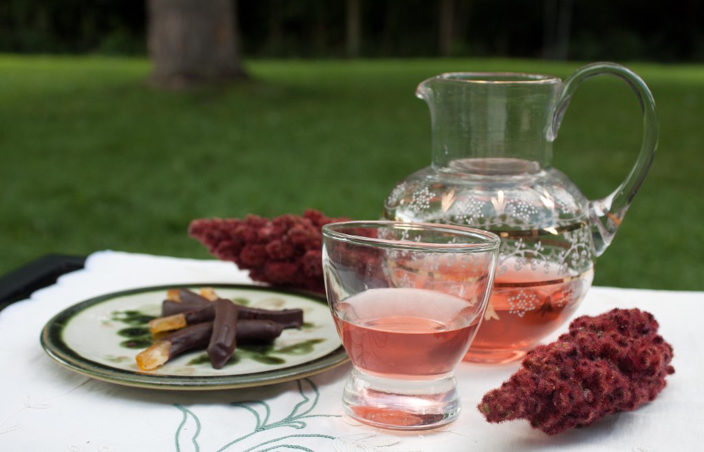 The staghorn sumac is used to make a beverage termed “sumac-ade”, “Indian lemonade”, or “rhus juice”. The drink is made by soaking the drupes in cool water, rubbing them to extract the essence, straining the liquid through a cotton cloth or coffee filter, and sweetening it with honey, maple syrup or raw sugar. Because the seeds and stalks contain bitter alkaloids that are extracted by hot water, use only cold water when making the sumac infusion.