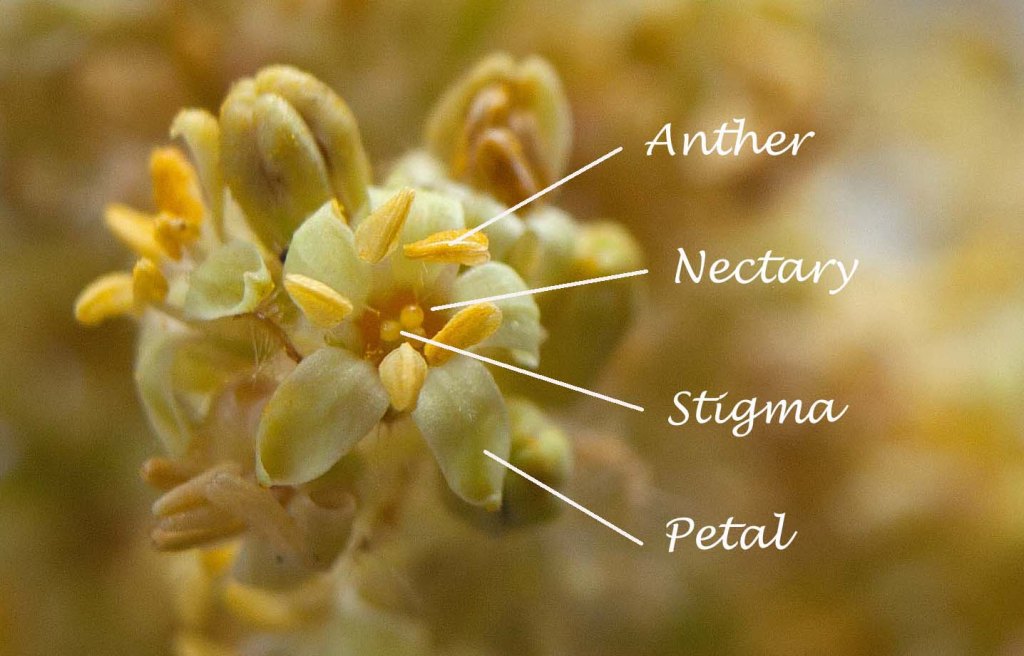 When I returned with this new knowledge, I inspected the florets of a male tree more closely and was puzzled that at the centre of some of the florets I saw a three-lobed stigma (the female part of the flower). I later learned that male flowers can still have female parts—such as stigmas—but they are sterile and do not produce eggs. It turns out that male and female flowers initially form with the same parts but in a male the gynoecium aborts and in the female the stamen and anther abort. So, in some cases, they’re still there; they just don’t function.