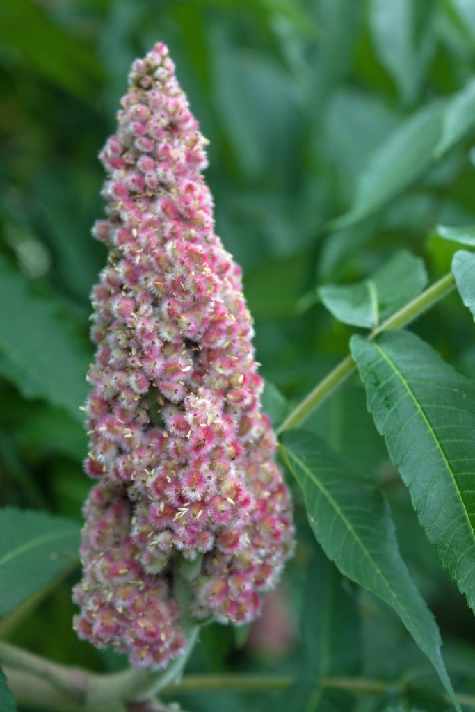 The Staghorn Sumac gets its name from the hairs on its young stems that resemble the velvet softness of a stag’s young antler. If you haven’t drawn your finger along a sumac’s stem before, it’s worth it to feel that delightful almost sticky-soft velvet. Each ‘Christmas tree’ flowering panicle contains hundreds of tiny pale yellow-green florets. As I inspected them I tried and failed to distinguish the male and female parts of a floret.