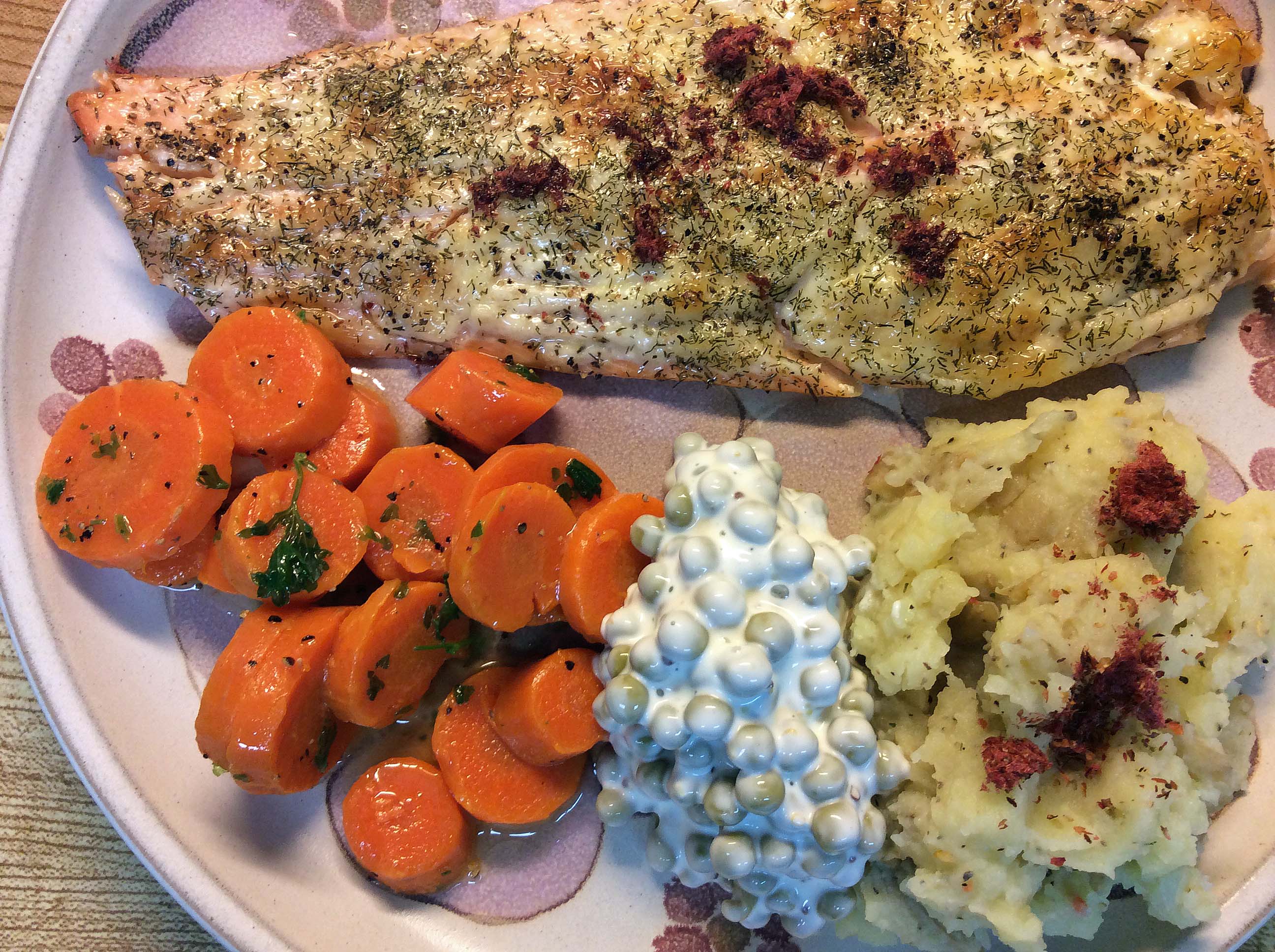 Once we’d created the spice, the next thing to do was try it out. I made a dish of rainbow trout with smashed potatoes and glazed carrots with parsley and a pea salad. I then garnished the meal with sumac spice. Because of its similarity to lemon zest, the spice went extremely well with the fish and the potatoes. We were impressed!