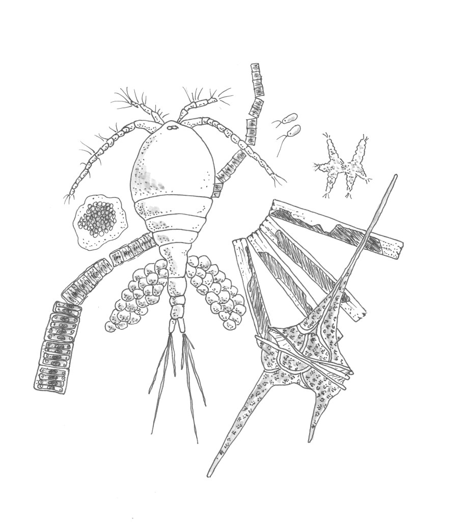But Lynna also talks about our primary producers, the phytoplankton (and their cousins the zooplankton). The phytoplankton—which is made up mostly of single-celled diatoms—drift on the ocean currents and sustain all life from producing the first source of a massive food chain to sequestering carbon, creating clouds and rain, and helping to create fifty percent of the oxygen we breathe.