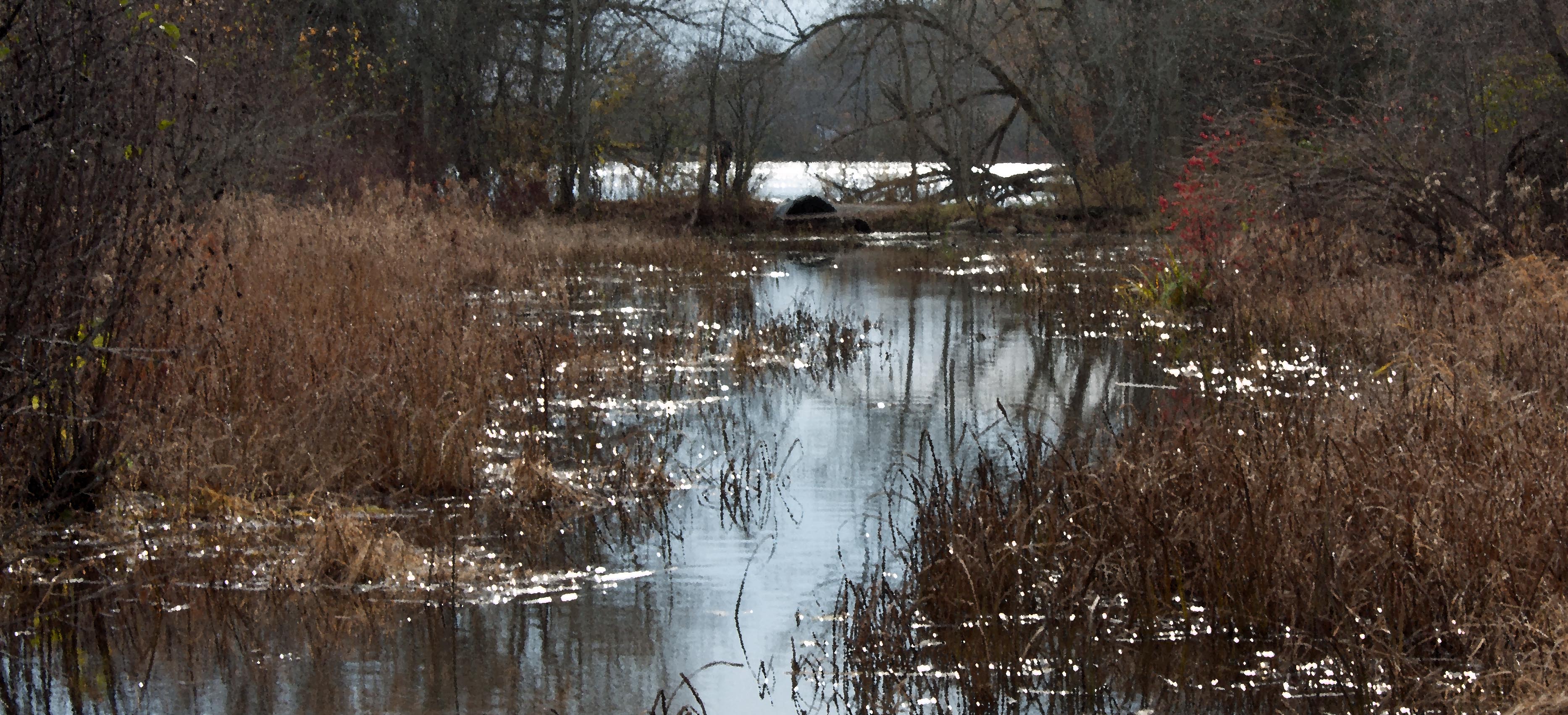 It was early on a crisp November morning and the sun was barely shining through the haze, but just enough to touch the marsh with gossamer streaks… I’d wandered a new way through the riparian forest on a narrow path along the creek. The path opened to a crumbled bridge made of broken concrete across the creek where I flushed out some ducks with my clumsy footsteps. I looked downstream at the marsh to where it flowed into the Otonabee River (which looked more like a lake from where I stood) and saw my prize.