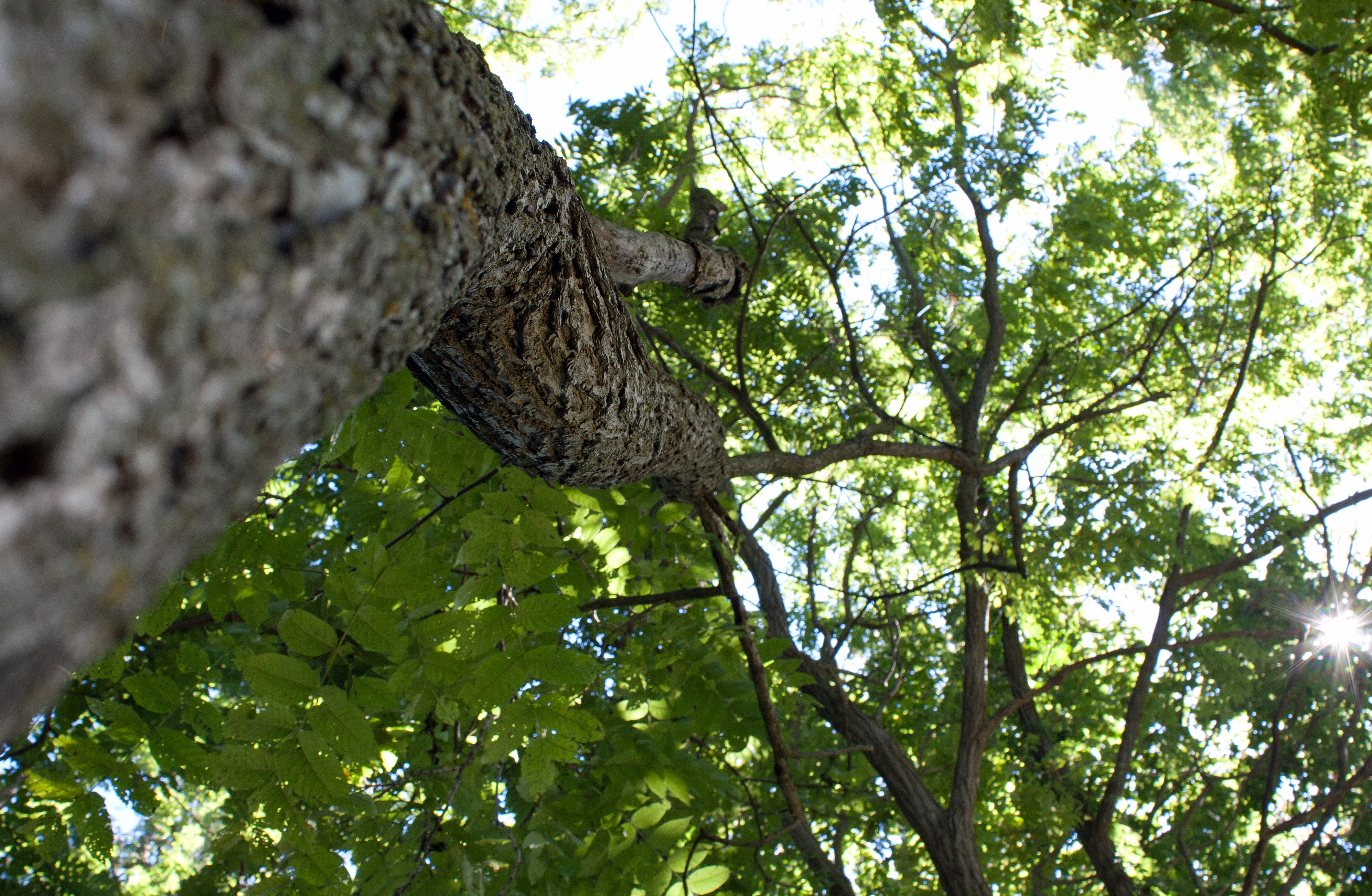 Some of the tallest black walnut and black locust trees have girths of close to a metre. Around them are a good number of younger trees. All are putting on their fall clothes and preparing for winter with seeds and copious nuts. My hand brushes up against the corky gnarled bark of a giant black walnut. First, I look up at its extensive canopy, spread out in all directions. Then I take a closer look at the bark. It is so much more than bark; it is a crenelated complex community of moss, lichen and fungi. In Mosses of the Northern Forest, Jerry Jenkins describes the evolution of bark communities as trees grow older: “young trees, with small crowns and tight bark, have limited stem flow and storage. They are colonized by a relatively small group of pioneer [moss] species that make thin mats and small dense tufts. As the crown increases and the bark roughens, storage and flow increase, and the pioneers are supplemented by species that make fringes and shaggy mats on the trunk and thick stockings covering the base…the tree base accumulates soil and becomes an extension of the forest floor.”