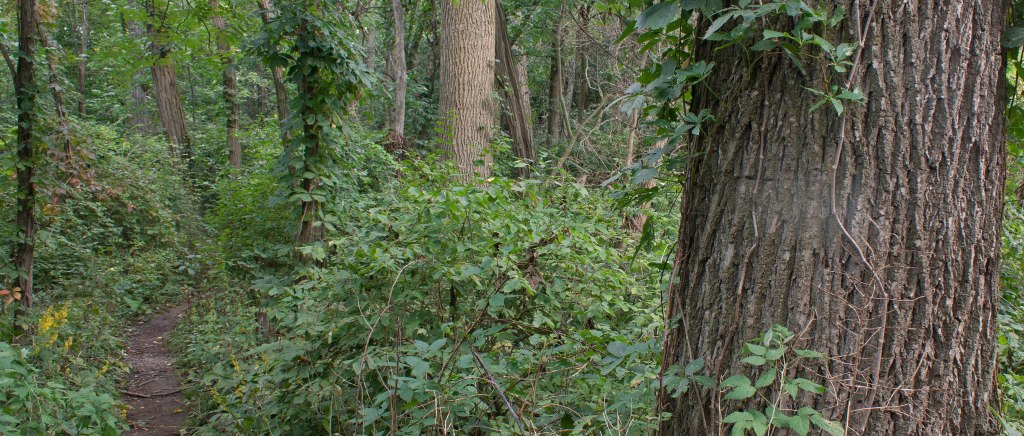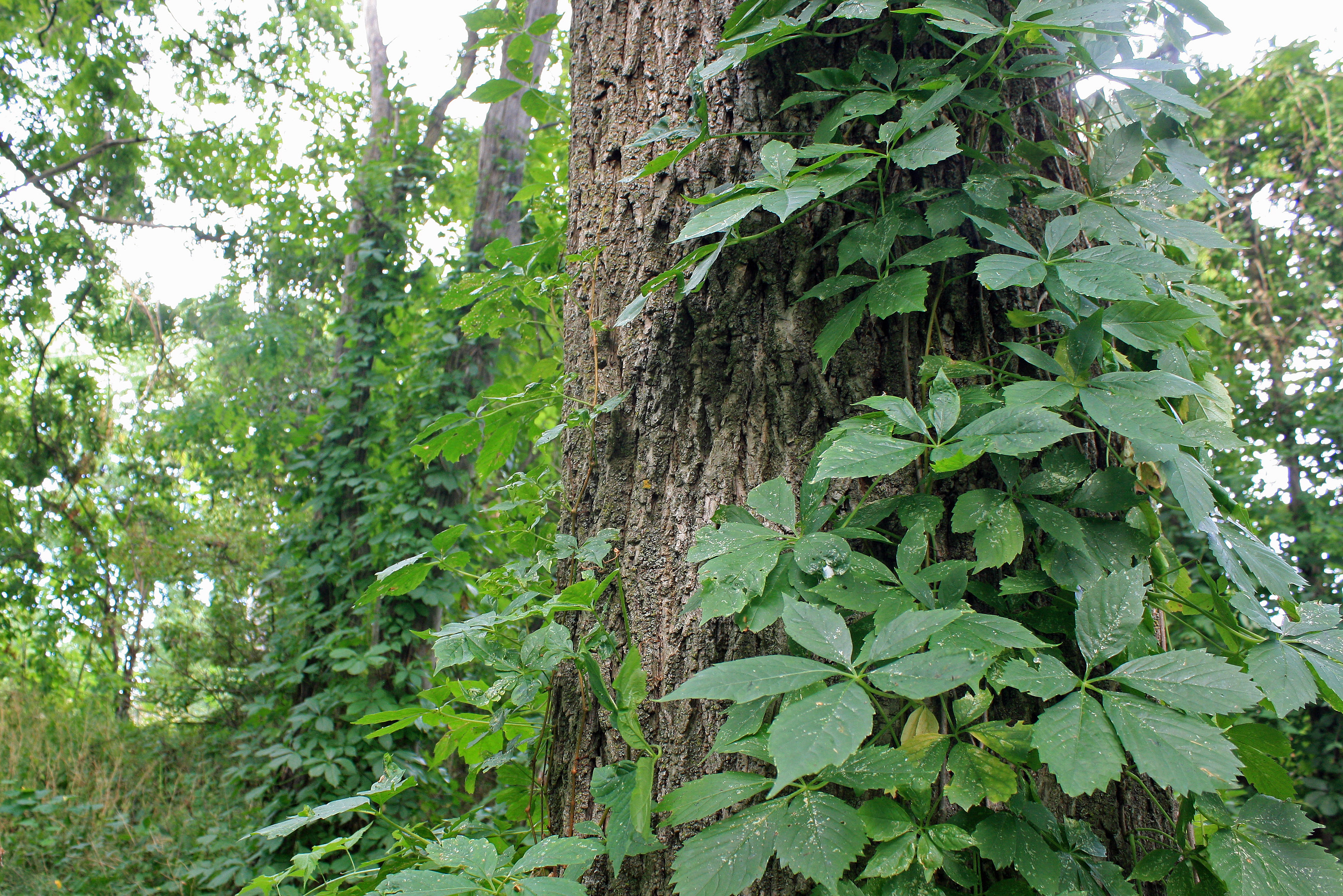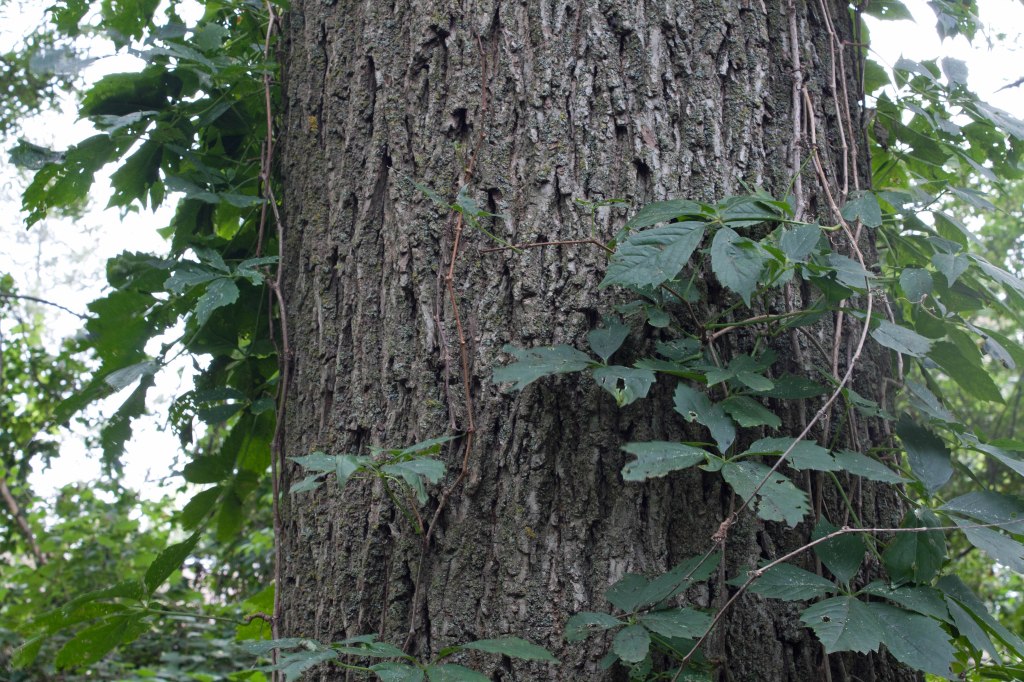 This riparian woodland along the Otonabee River is dominated by giant and stately black walnut and black locust trees. The trees tower like frost giants, canopies draping over the remaining forest like open umbrellas. Beneath them, the ashes, elms, bur oaks and maple trees create a dense understory, along with dogwood, buckthorn, elderberry and honeysuckle. The forest floor oozes with a dense undergrowth of mosses, Virginia creeper, brambles and wild grape. They creep up the older trees and shrubs, pulling up the forest floor like a stocking, and adding reds and vermillion to the rough greys of bark. The occasional jack-in-the-pulpit and colonies of stinging nettle fill out the rest.