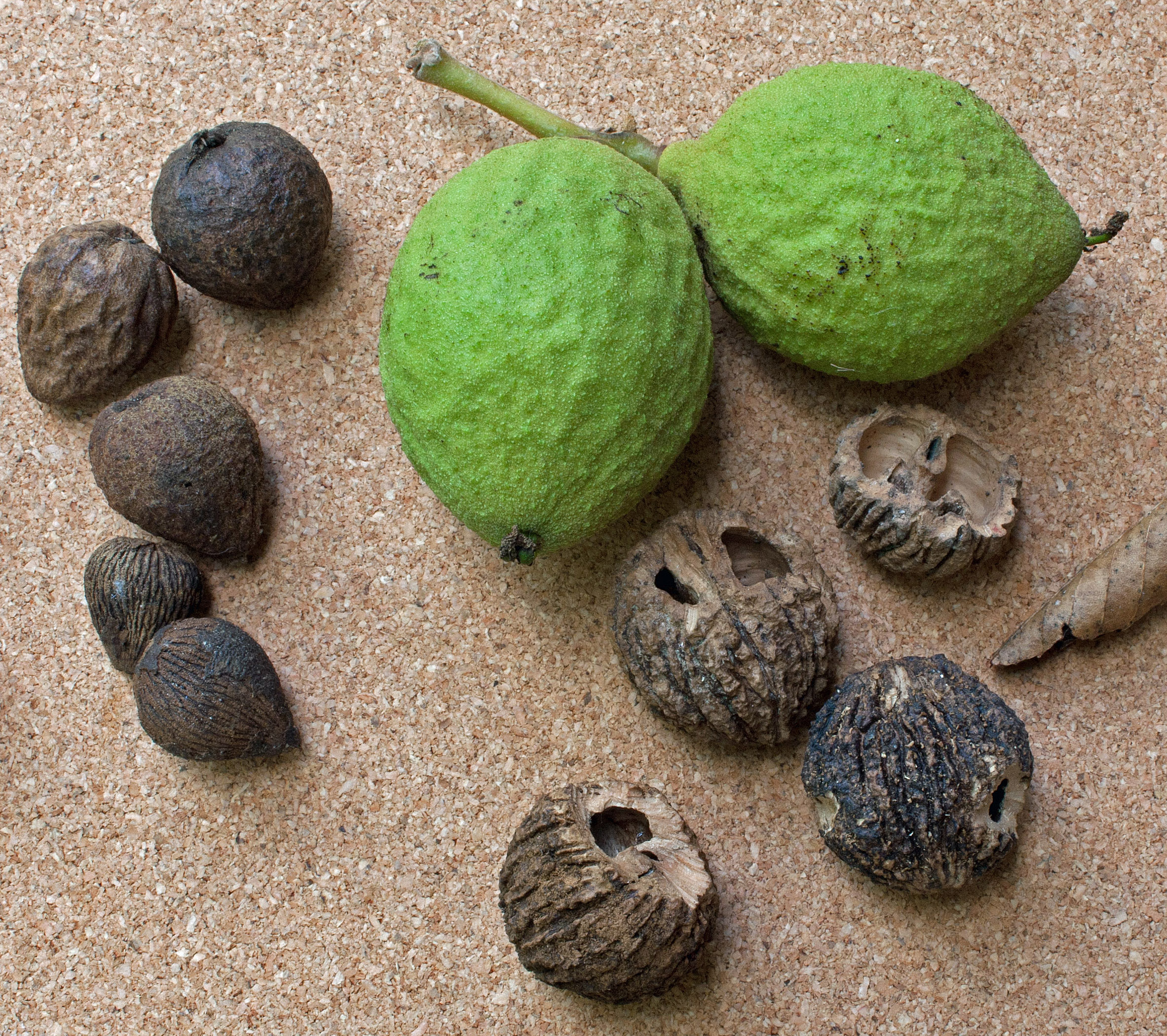 The black walnut is self-fertile (it’s monoecious, containing both male and female flowers) but still requires wind for pollination. The male (staminate) flowers occur as drooping catkins 8–10 cm long. These are borne from axillary buds on the previous year’s growth. The female (pistillate) flowers are terminal, in clusters of two to five on the current year’s growth. It takes 12-15 years for the tree to bear nuts, whose outer shell is very hard. They ripen in the early autumn and drop in October. Black walnut trees live over 200 years and up to 300 years.