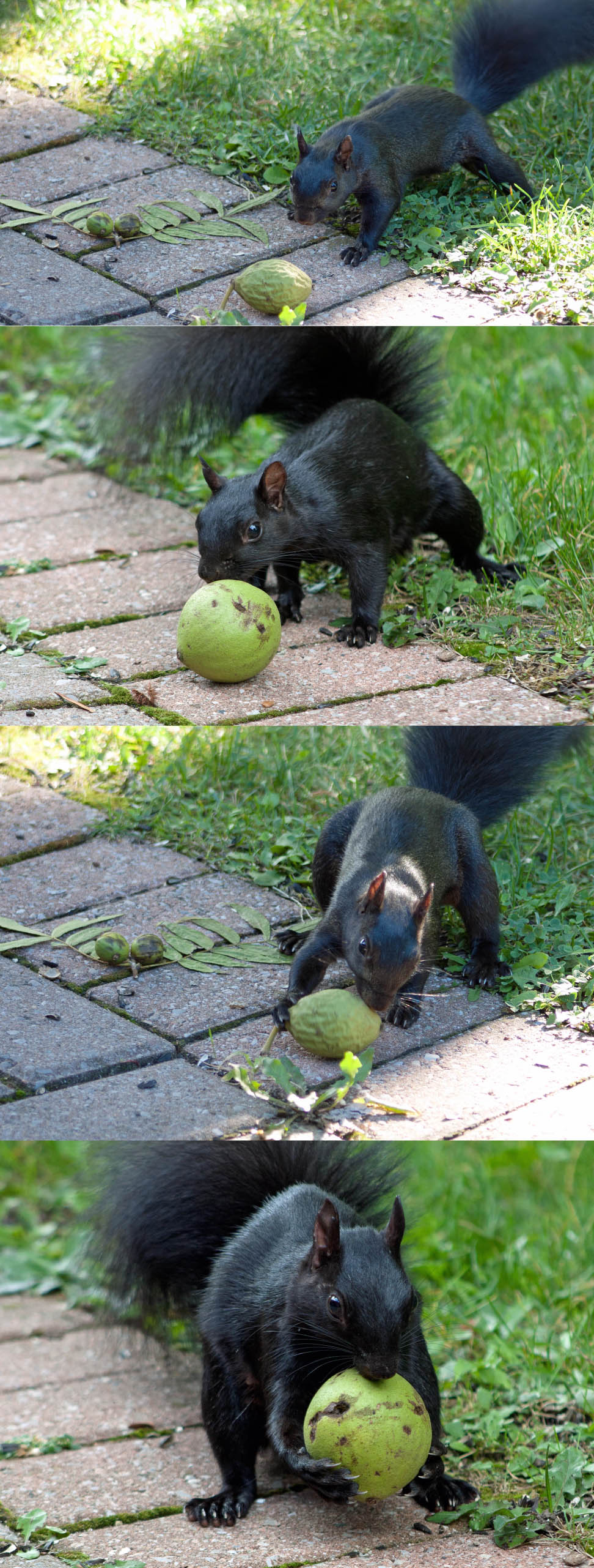 Thanks to the inky chemical juglone that surrounds the inside nut, the squirrel’s snout often bears a walnut-stain. Though not easily seen on a black squirrel, the grey squirrel visibly displays a dark brown to golden ‘beard’ during this season.
