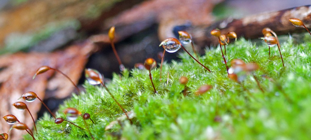 Moss with spore capsules after a rain, ON (photo by Nina Munteanu)