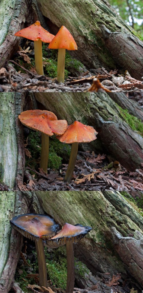 As the waxcap mushroom develops, the cap spreads out with a discernable brim while maintaining the hat peak of a witch’s hat. As it ages, it turns a deeper red-orange that blackens, often from the edges inward.