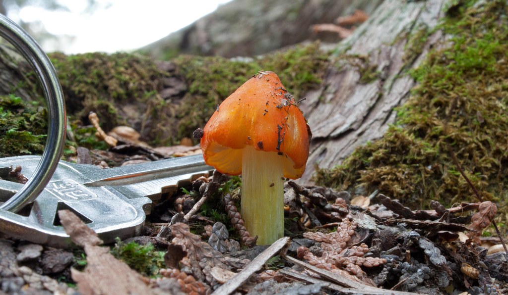 Witch’s Hats are a small agaric (cap from 1-4 cm across) that start out bright red to orange, sometimes almost yellow as they thrust up through the cedar duff, looking like buds. The conical pileus is often curved steeply with a fairly sharp top and sometimes with edges that curve slightly inward. The stem (stipe) is often white at the base blending to yellow and will stain black with age.