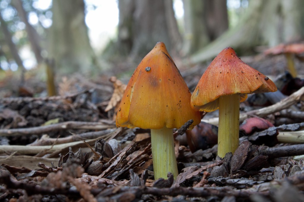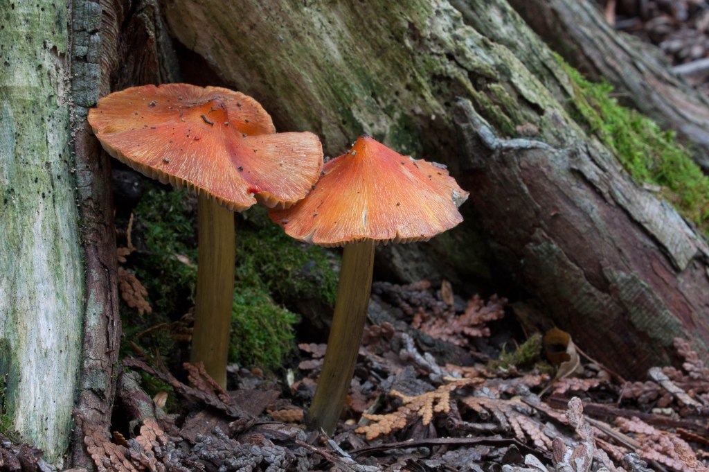 In my recent wanderings in the small cedar forest by the river near my house, I chanced upon a community of emerging reddish-orange fungi. They sat among the cedars in a crowded aggregation. Some pushed their way up through the duff like little buds, barely visible; others rose up with pointed steep caps; and others had opened further into tiny ‘witch’s hats’ and blackened.