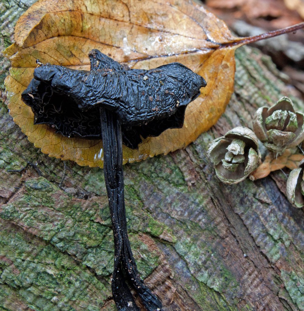 The Witch’s Hat (Hygrocybe conica), also known as Blackening Waxcap (for the obvious reason), shows a diversity of habitat preference and high variability. It tends to grow on the ground under hardwood and conifer trees. The community I stumbled upon fanned out from a few cedar trees in a small mixed cedar forest. The Witch’s Hat also likes mossy areas, where I found several near the river. The saprobic Hygrocybe conica is also a mycorrhizal fungus, sending tendrils from tree to tree.