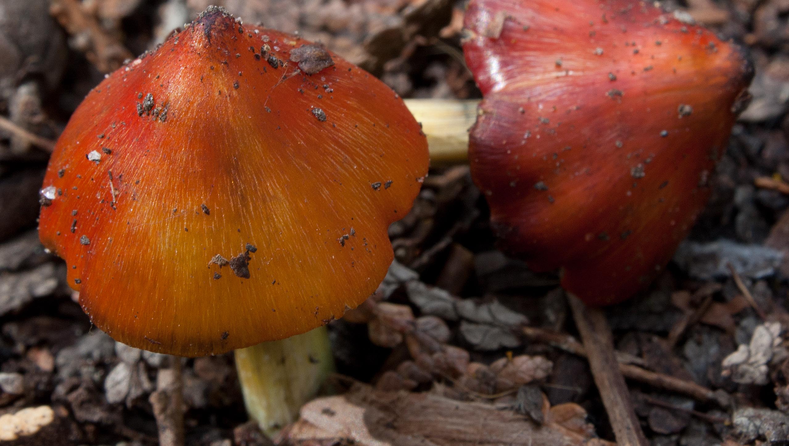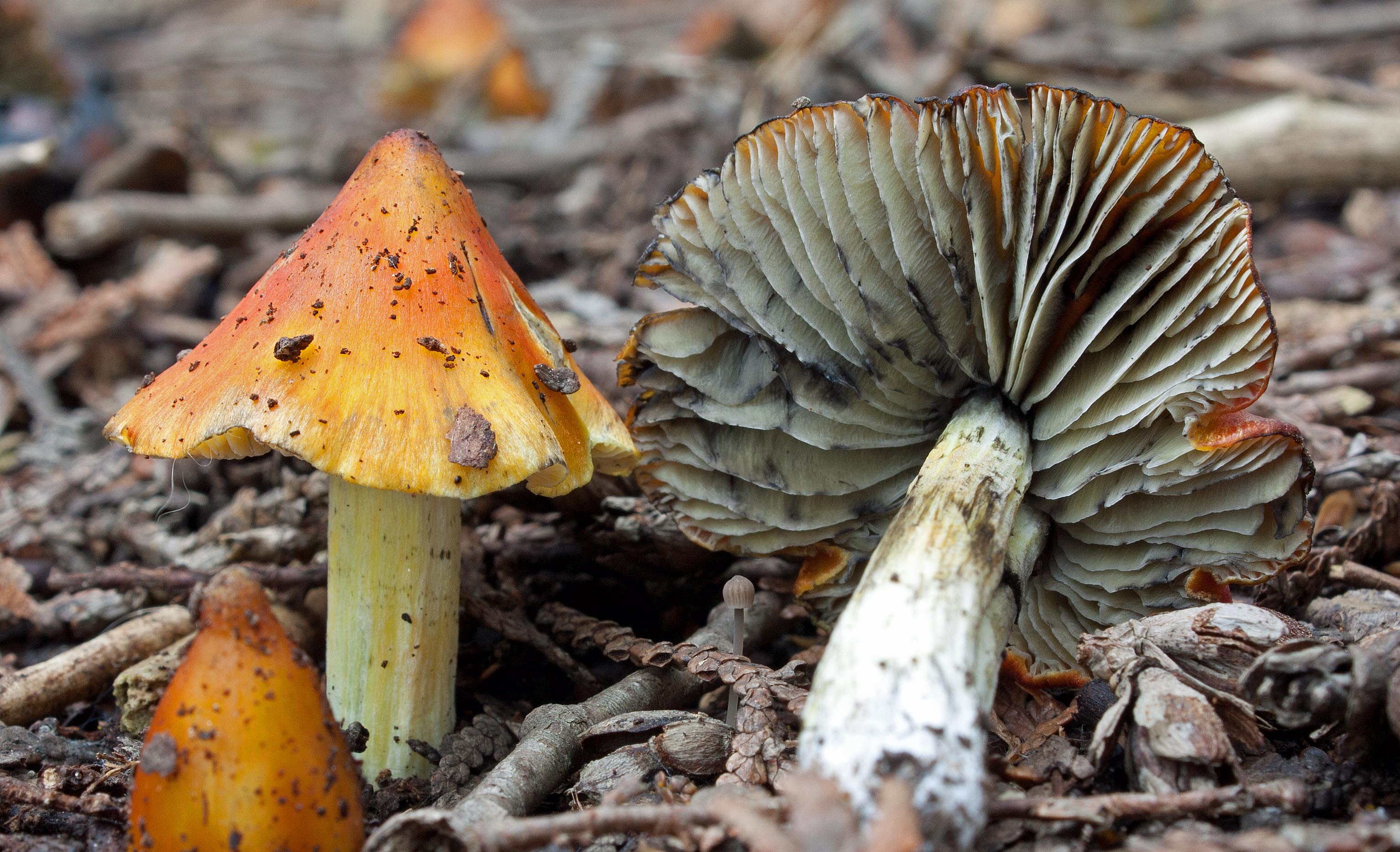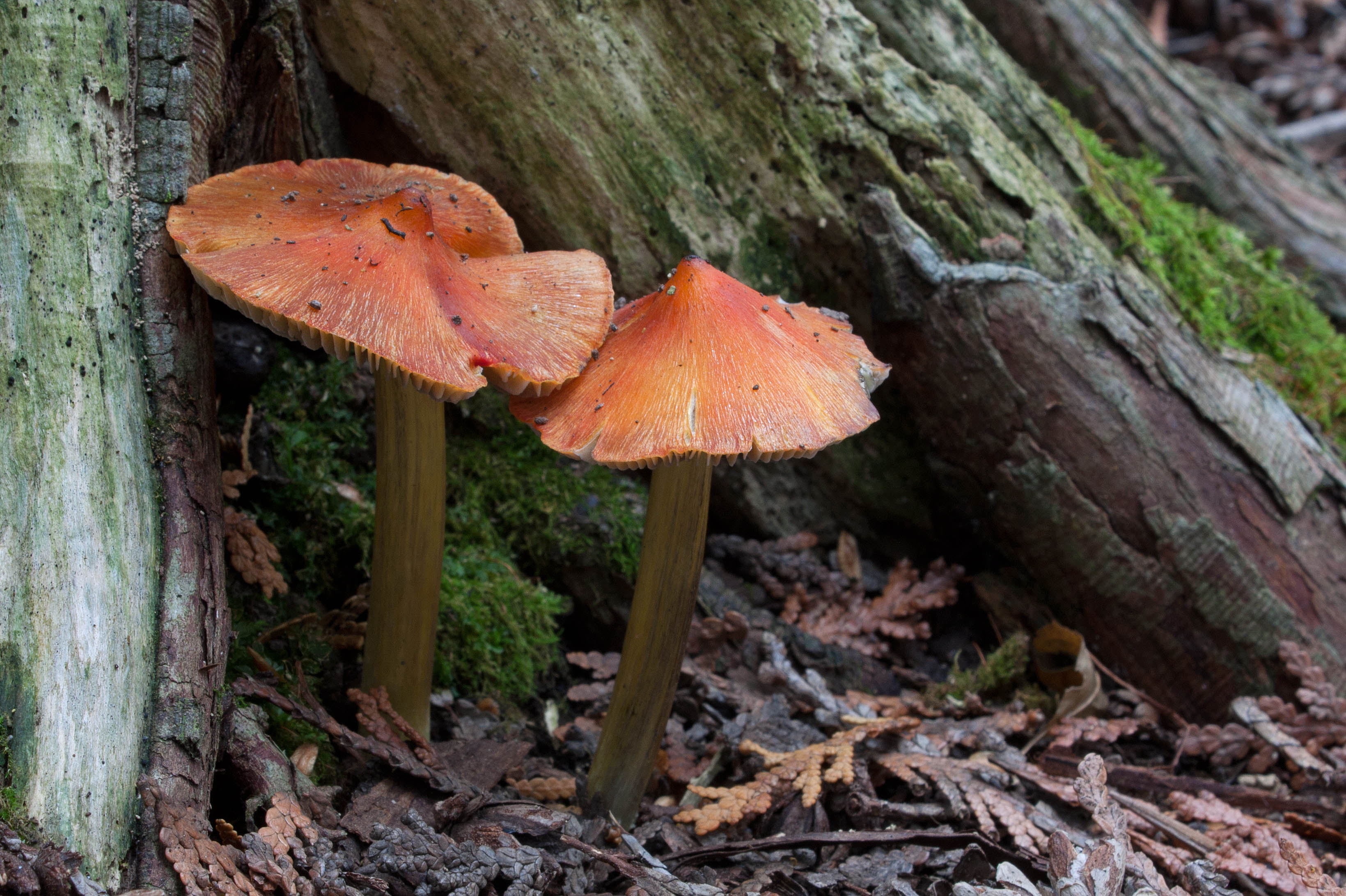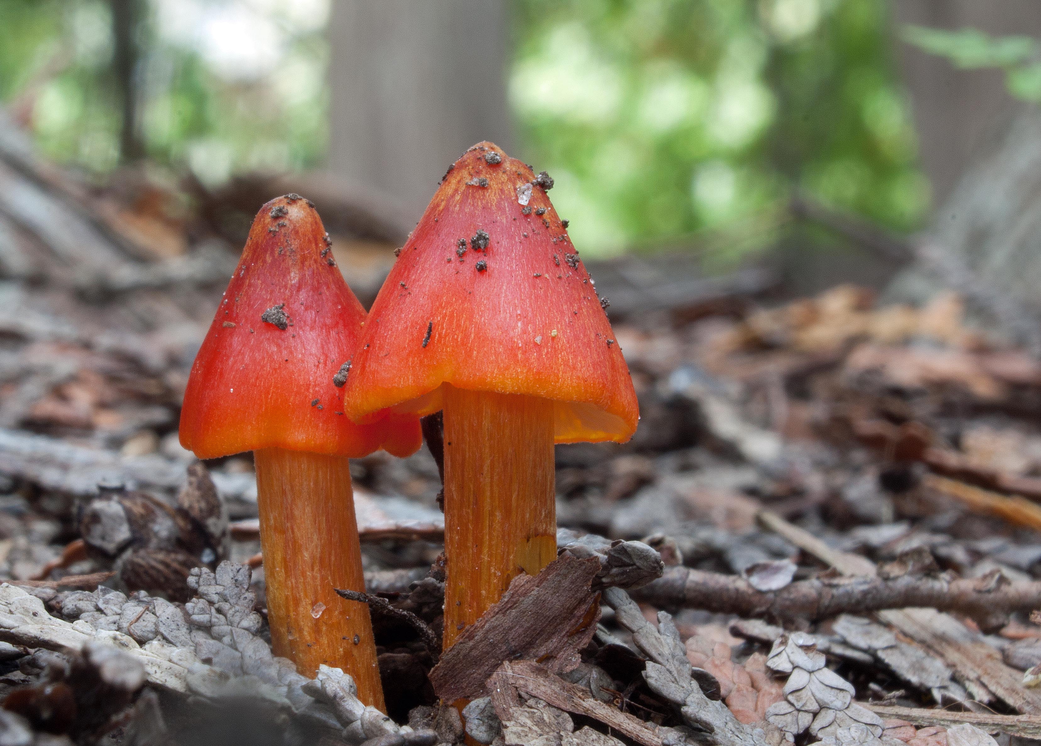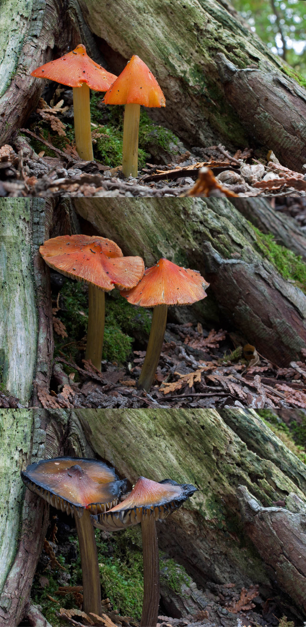 Witch’s Hats are a small agaric (cap from 1-4 cm across) that start out bright red to orange, sometimes almost yellow as they thrust up through the cedar duff, looking like buds. The conical pileus is often curved steeply with a fairly sharp top and sometimes with edges that curve slightly inward. The stem (stipe) is often white at the base blending to yellow and will stain black with age.