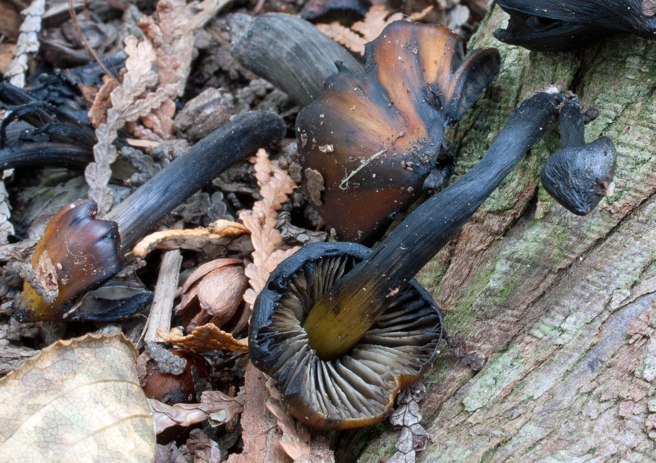 This tendency to blacken from bruising or with age is a good diagnostic for this mushroom. Very few others show this trait. Its gills “have the consistency of soft wax when rubbed between the fingers,” Fungus Fact Friday tells us. The gills start white to yellowish and gradually yellow and stain black.
