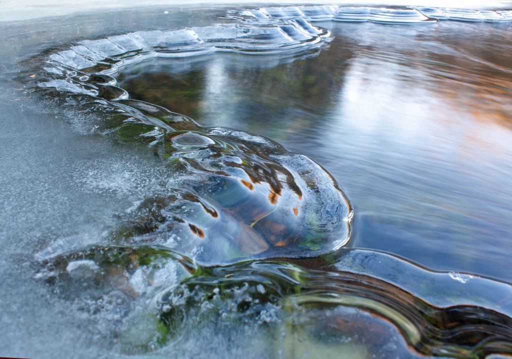 On a quiet surface with little wind, such as a protected bay or pond, clear ice forms in very cold weather. Transparent ice may resemble Goethe glass and reflect light like clear water. John A. Downing, director of The University of Minnesota Sea Grant tells us that this “primary ice” is crystalline and composed of hexagonal plates, needles, or sheath-like structures with large crystals oriented up and down. It can be transparent, like glass, or slightly cloudy, reflecting a deep or aqua-turquoise blue, depending on the materials the crystals nucleate on. When the ice cover expands from the shore to the entire river or lake, it’s called fast ice because it’s held fast by the shore.
