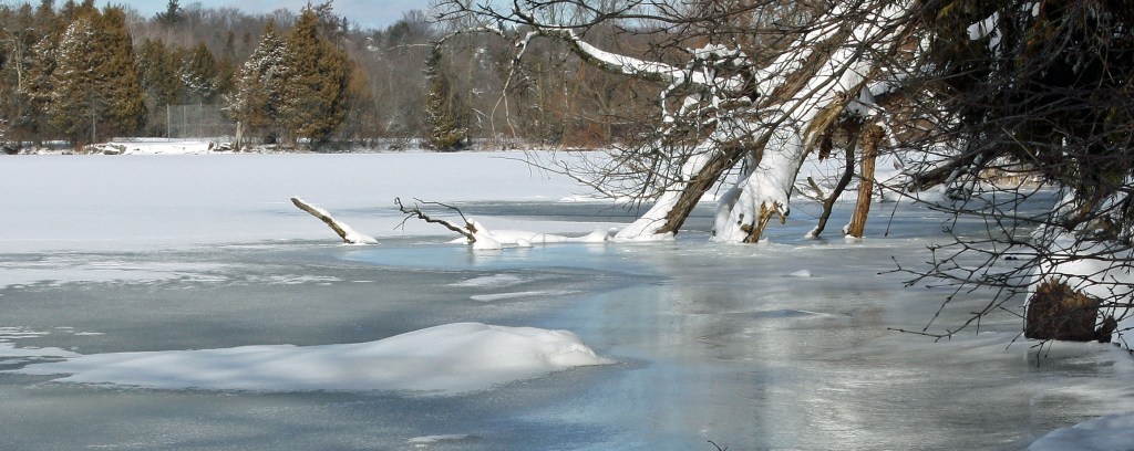 During my walks along the Otonabee and Thompson Creek, its tributary stream/marsh, I often witness the clear ice formations in the calm bay leading to the larger river. Some of the most beautiful ice formations arise when water vapor condenses directly into frost or rime when it’s cold enough during a freezing fog.