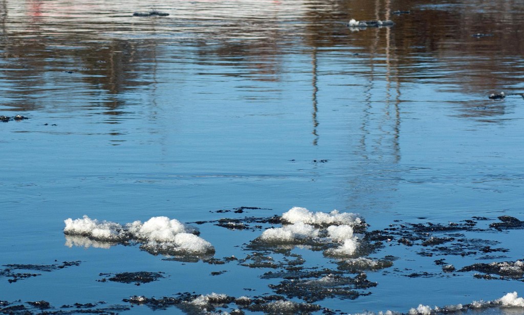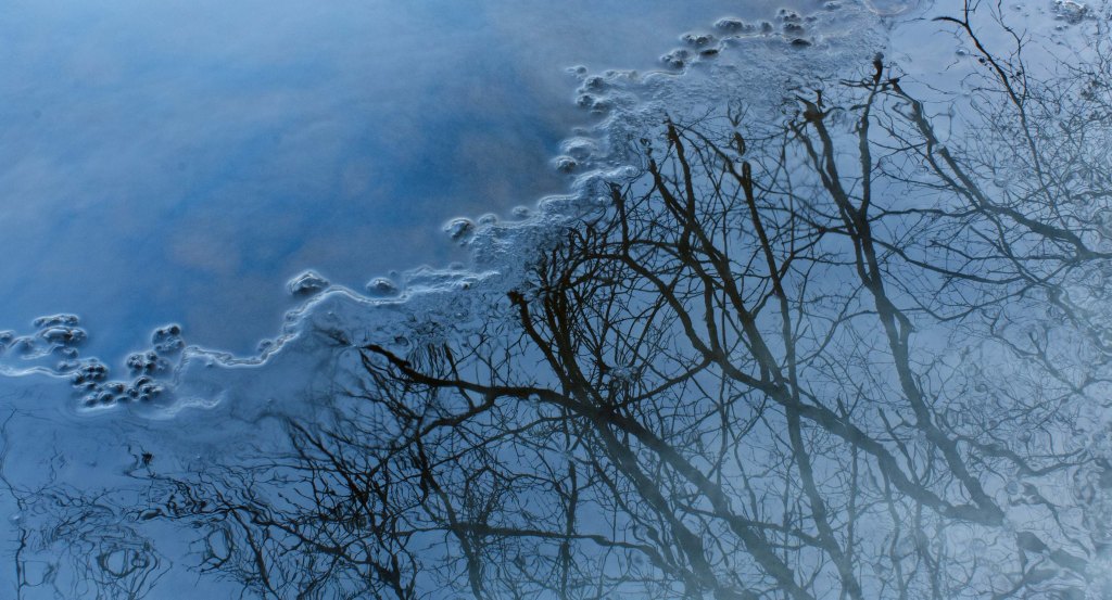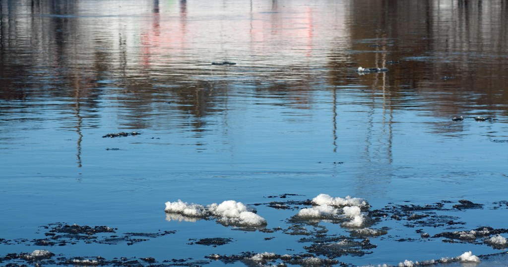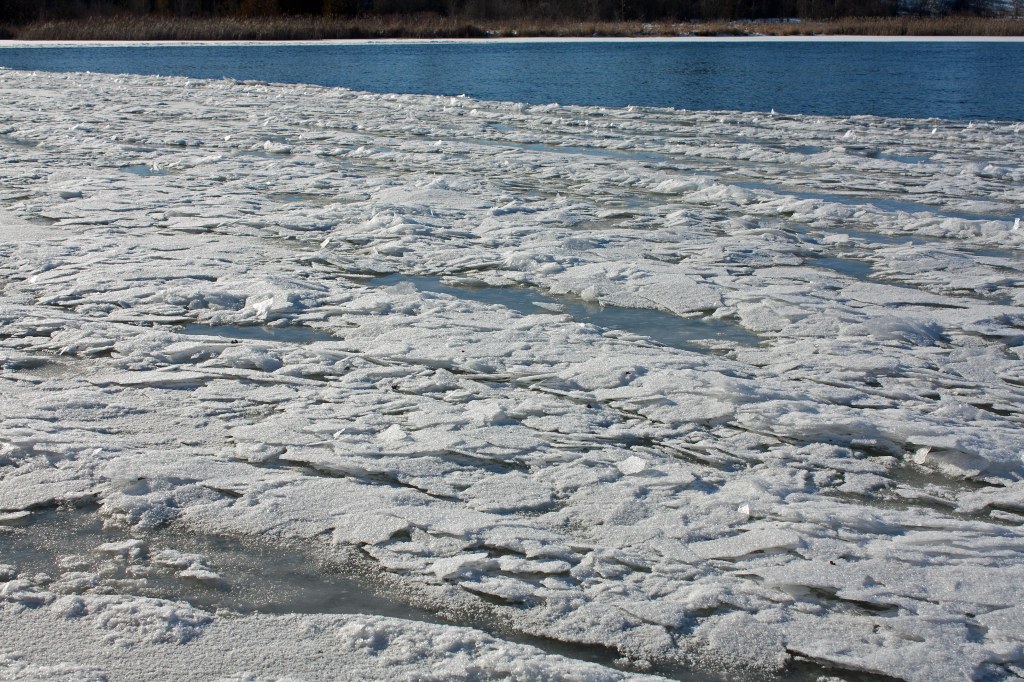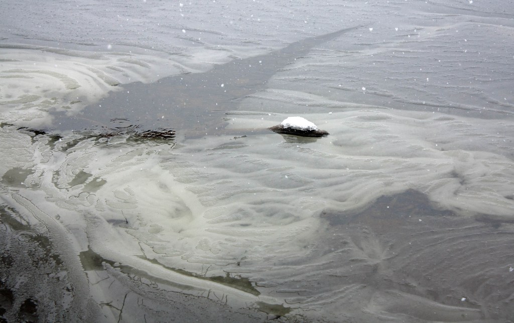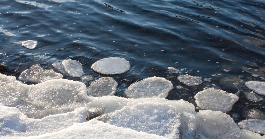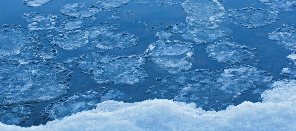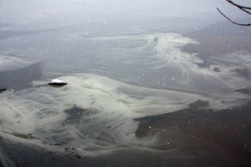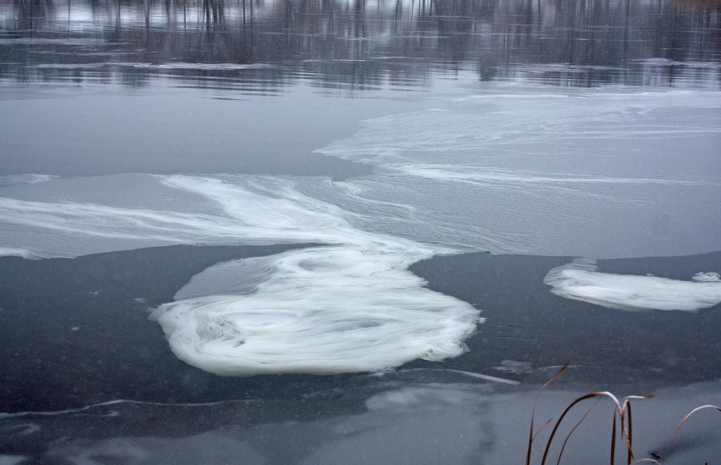 As early as November, when it’s freezing cold and water supercools, ice crystals (frazil ice) form and mix into the waterbody’s upper layer. The process can be accelerated when snow falls on the waterbody, contributing ice crystals and often creating grease ice. The ice molecules expand into an organized latticework that is less dense and lighter than liquid water, allowing it to float. Frazil ice often develops into slushy clumps of white ice a few centimeters across (grease ice or slushy, spongy grease ice called shuga).
