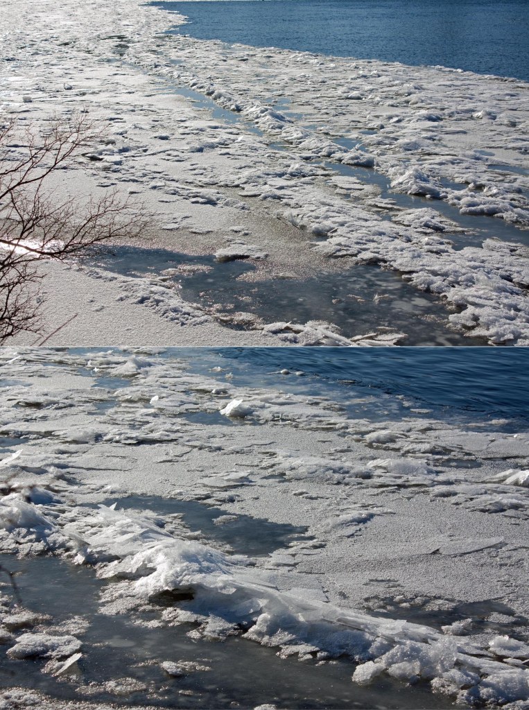 In an ice jam just upstream of Trent University and Lock 22 (Nassau Mills), frozen waves of ice fraziling had formed. Thin shards of broken ice rind had rafted over each other to form rows of frozen waves and hummocks as the ice jam grew upstream from the dam. It resembled a freshwater version of stamukhi ice (Russian word for sea ice rubble that develops along the boundary between fast ice and drifting pack ice).