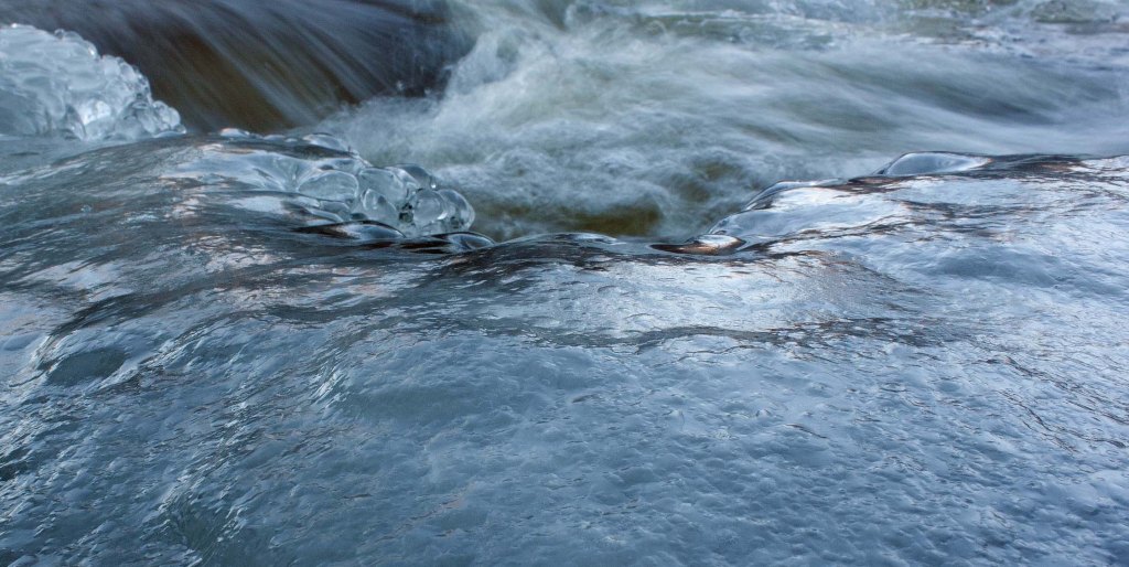 I’ve been enjoying the seasonal changes of the river, along with the ostensible water level changes imposed throughout the seasons by the various dams and diversions. This has been particularly interesting for me during the onset and duration of winter, when ice and snow play a role in the river’s character. When it’s sufficiently cold (at zero degrees Celsius or 32 degrees Fahrenheit), ice forms. It can form as a solid sheet on lakes and rivers and on land (as a glacier). Ice can also occur as frost, snow, sleet and hail.