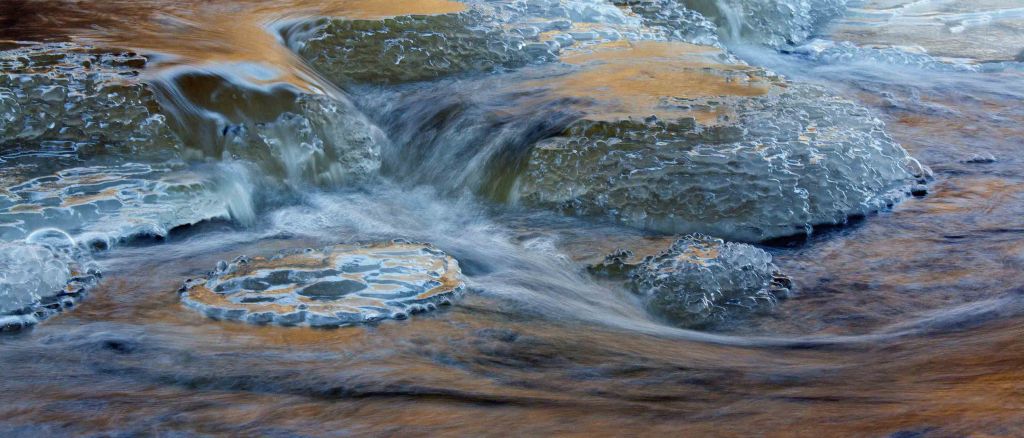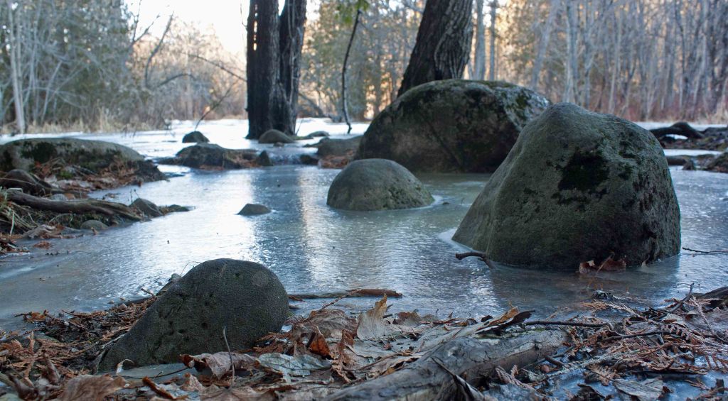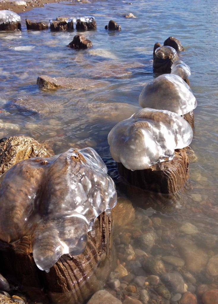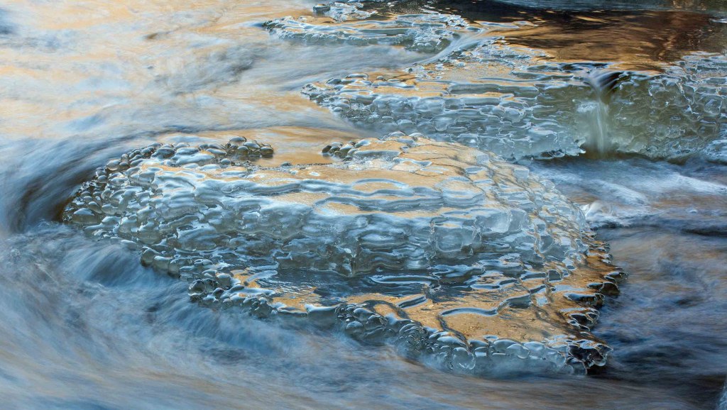 Ice rind is a brittle shiny crust of ice that forms on a quiet surface by direct freezing or from grease ice. Ice rind is quite thin, from 1 to 5 cm thick, and easily breaks with wind action or water swells, usually in rectangular pieces. I saw several larger pieces drifting between dams, colliding and rafting over each other and eventually finding themselves consolidated into a downstream ice jam above another dam. Rind ice is best seen suspended in a crispy film around marsh reeds when the water level of the river goes down. Then the brittle ice breaks off into pieces, leaving various river vegetation and rocks with ice collars. I’ve also seen beautifully sculpted ice shapes that have formed on exposed rocks in Jackson Creek as the turbulent creek flows around them. ice sculptures resembling clear pearls or steps into heaven shone like jewels in the sunlight.