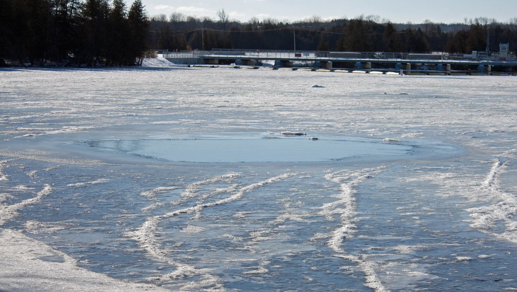 Pancake Ice is ice that spins around in waves and thickens into free-floating ice disks. It forms particularly where the turbulence of rough water and rapids affect slush or ice rind, just downstream of a dam. This is exactly where I’ve seen pancake ice of varying sizes on the Otonabee River (pancakes from as small as 4-centimetres to as large as 3-metres wide and up to 10 cm thick). These were particularly noticeable below the dam associated with Lock 23.