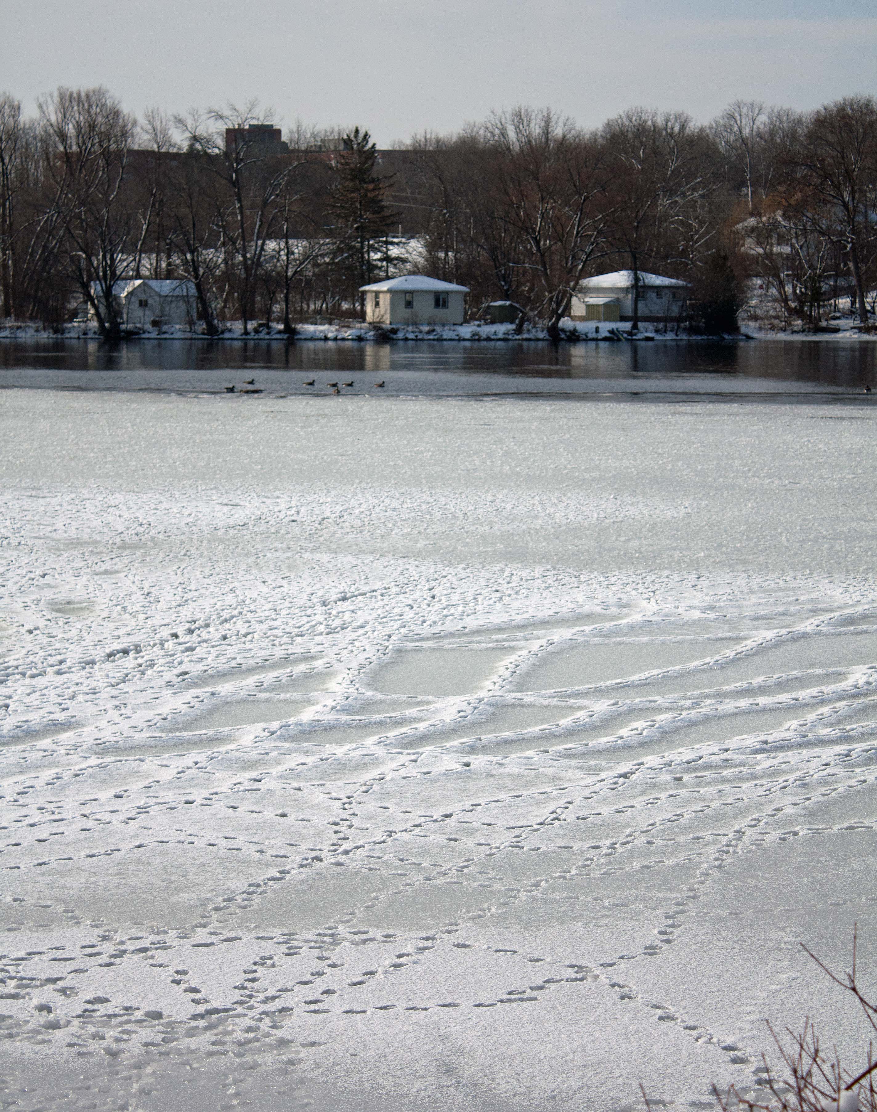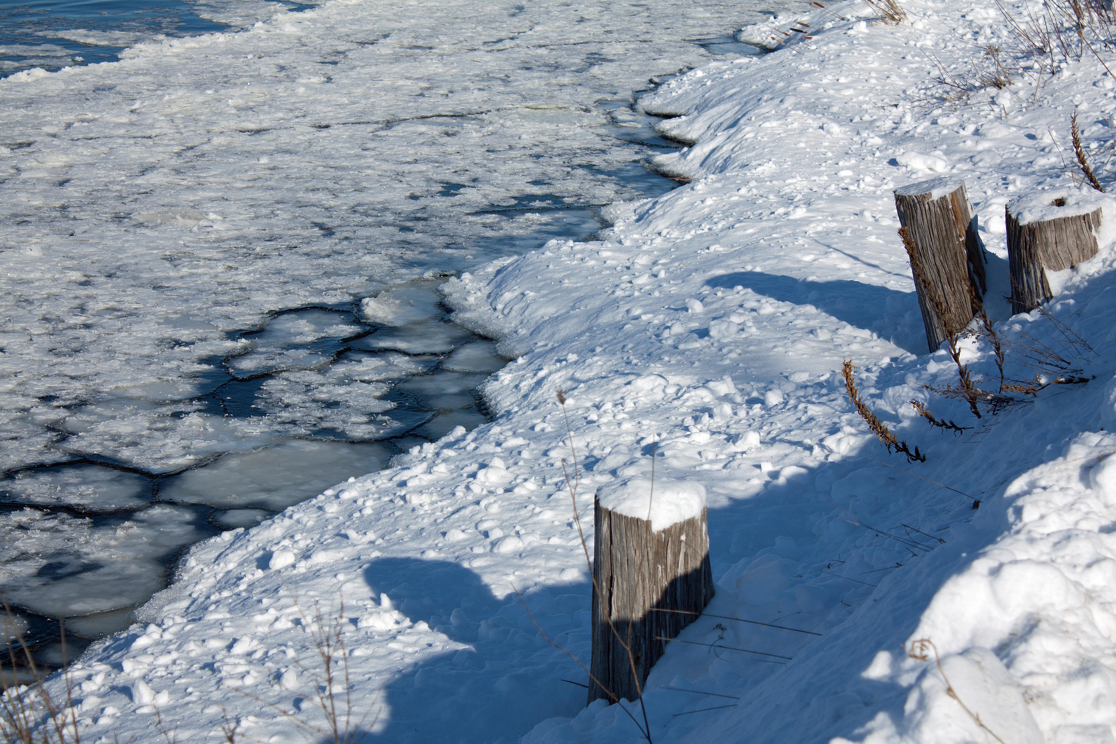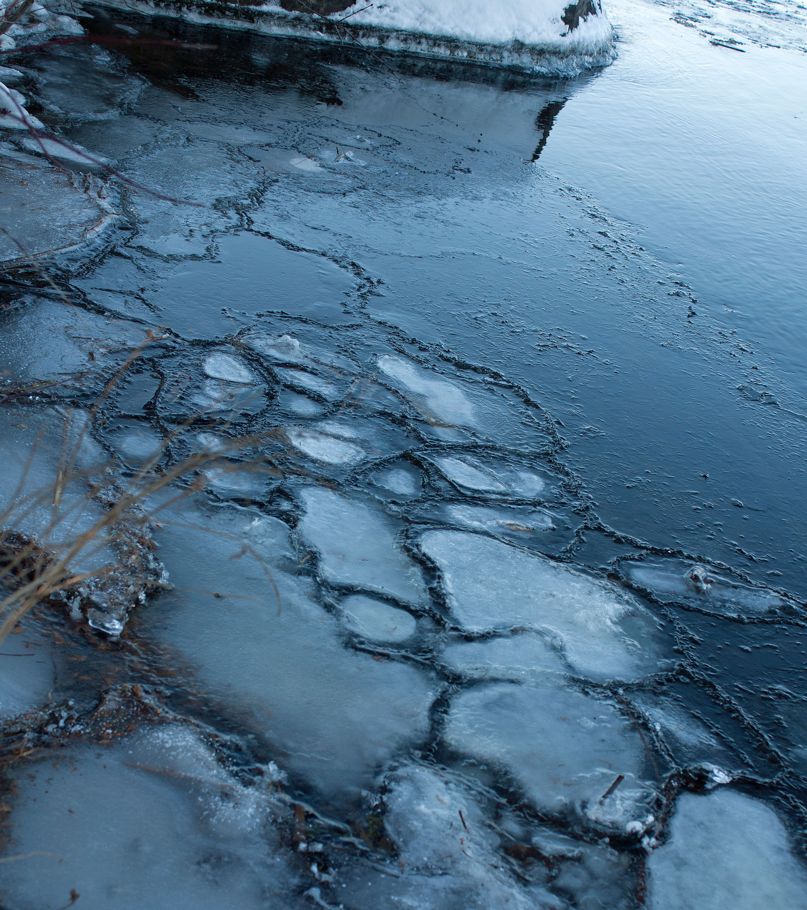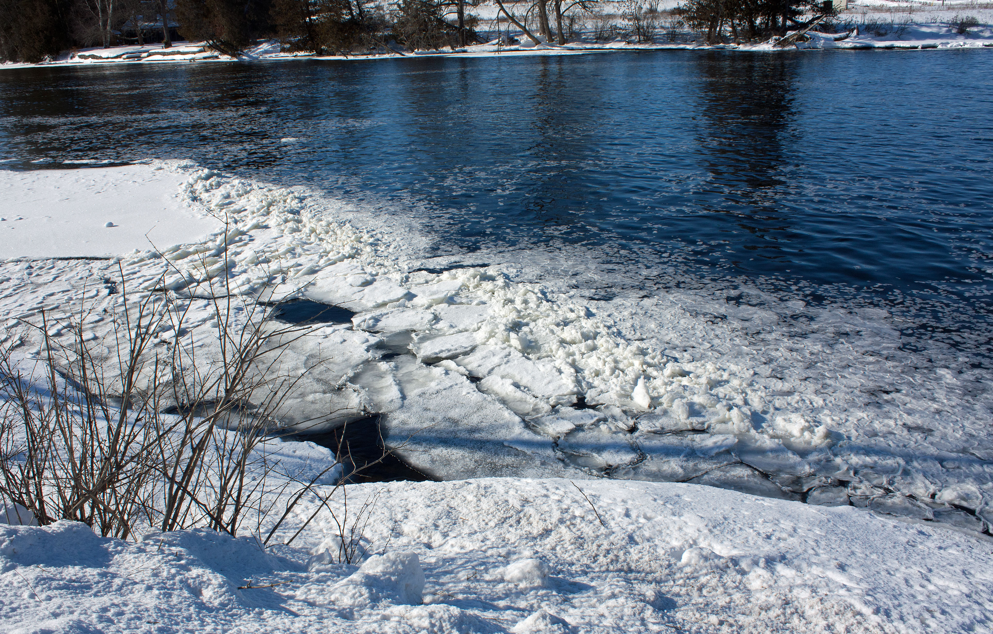 I’ve been enjoying the seasonal changes of the river, along with the ostensible water level changes imposed throughout the seasons by the various dams and diversions. This has been particularly interesting for me during the onset and duration of winter, when ice and snow play a role in the river’s character. When it’s sufficiently cold (at zero degrees Celsius or 32 degrees Fahrenheit), ice forms. It can form as a solid sheet on lakes and rivers and on land (as a glacier). Ice can also occur as frost, snow, sleet and hail.